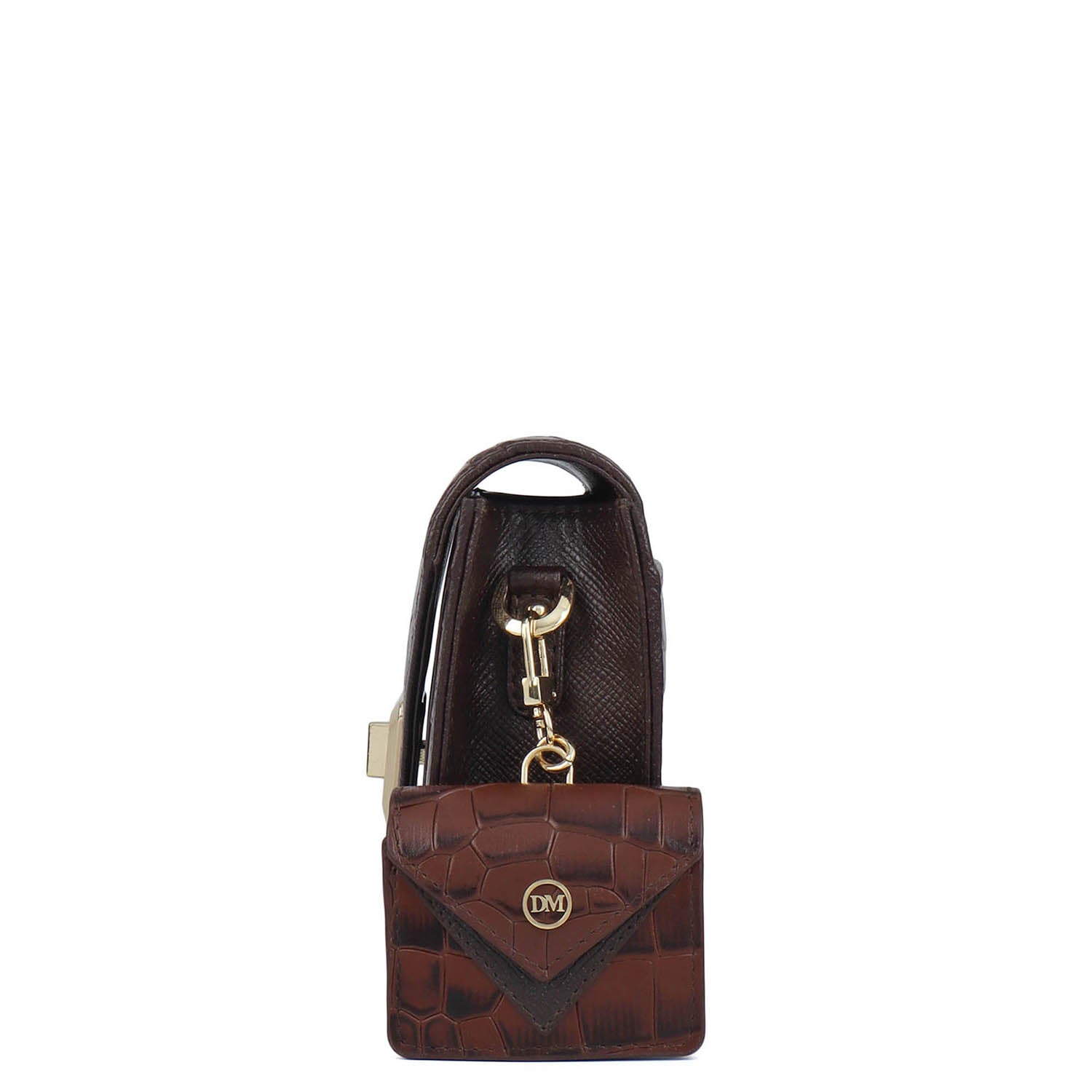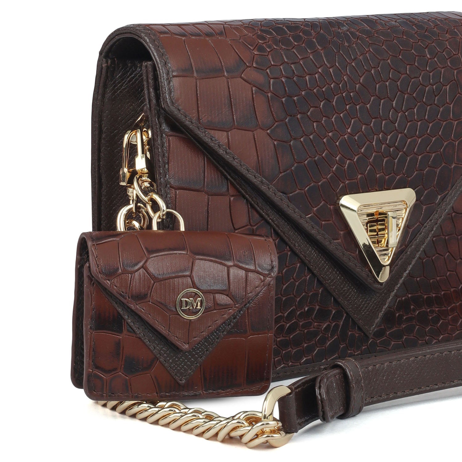 Designed for ease and impact, this crossbody bag features a refined blend of croco and franzy leather, giving it both texture and character. The twist lock closure adds security with style. Its compact yet efficient interior is fitted with in built card holder—perfect for organizing essentials like your phone, cards, and keys. A matching AirPod case completes the design, seamlessly integrating tech-savvy functionality into this everyday accessory. Lightweight, structured, and effortlessly stylish, this crossbody is made for movement without compromising on elegance.