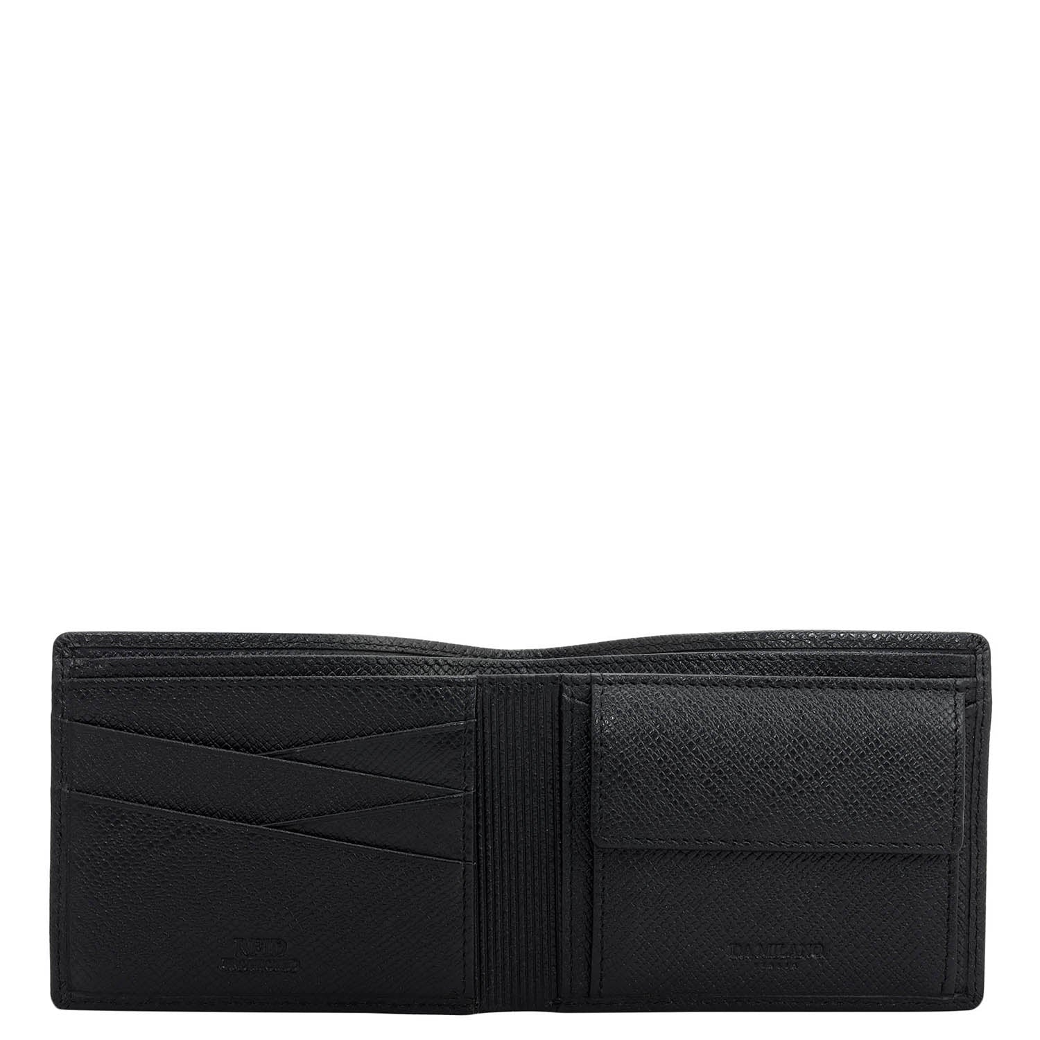Crafted from textured leather, Da Milano men's bifold wallet offers a compact yet stylish design. Featuring easy-to-organize compartments, card slots, and pockets, it combines practicality with elegance. Subtle branding on the front enhances its refined appearance.