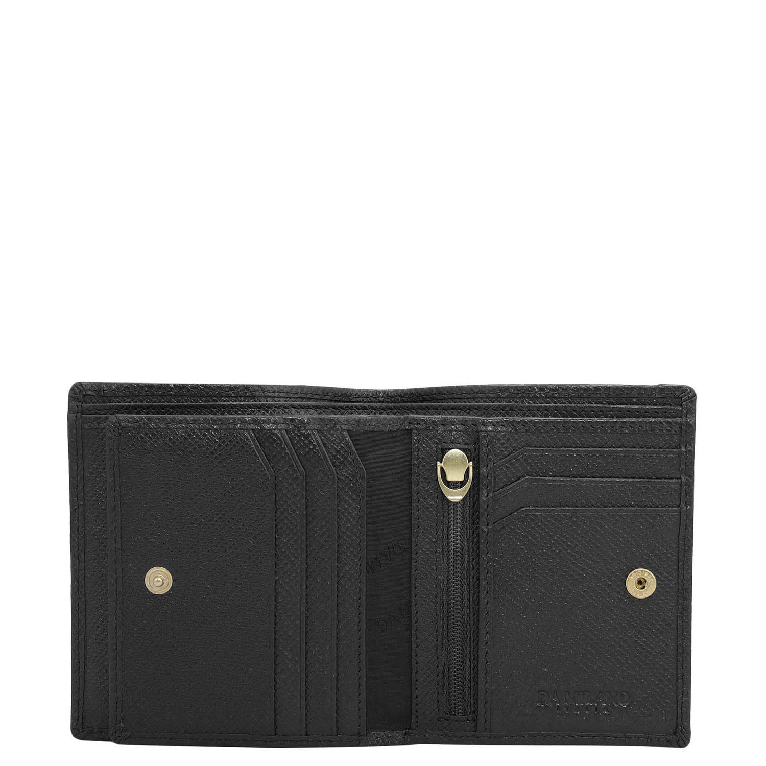 Crafted from textured leather, Da Milano men's bifold wallet offers a compact yet stylish design. Featuring easy-to-organize compartments, card slots, and pockets, it combines practicality with elegance. Subtle branding on the front enhances its refined appearance.