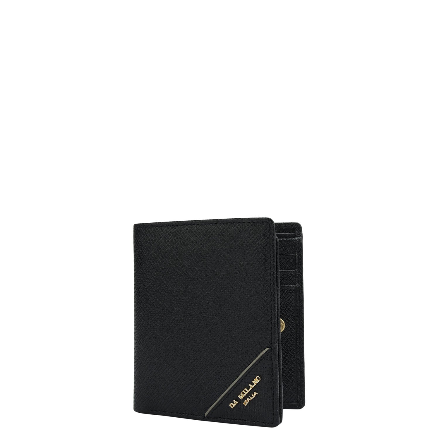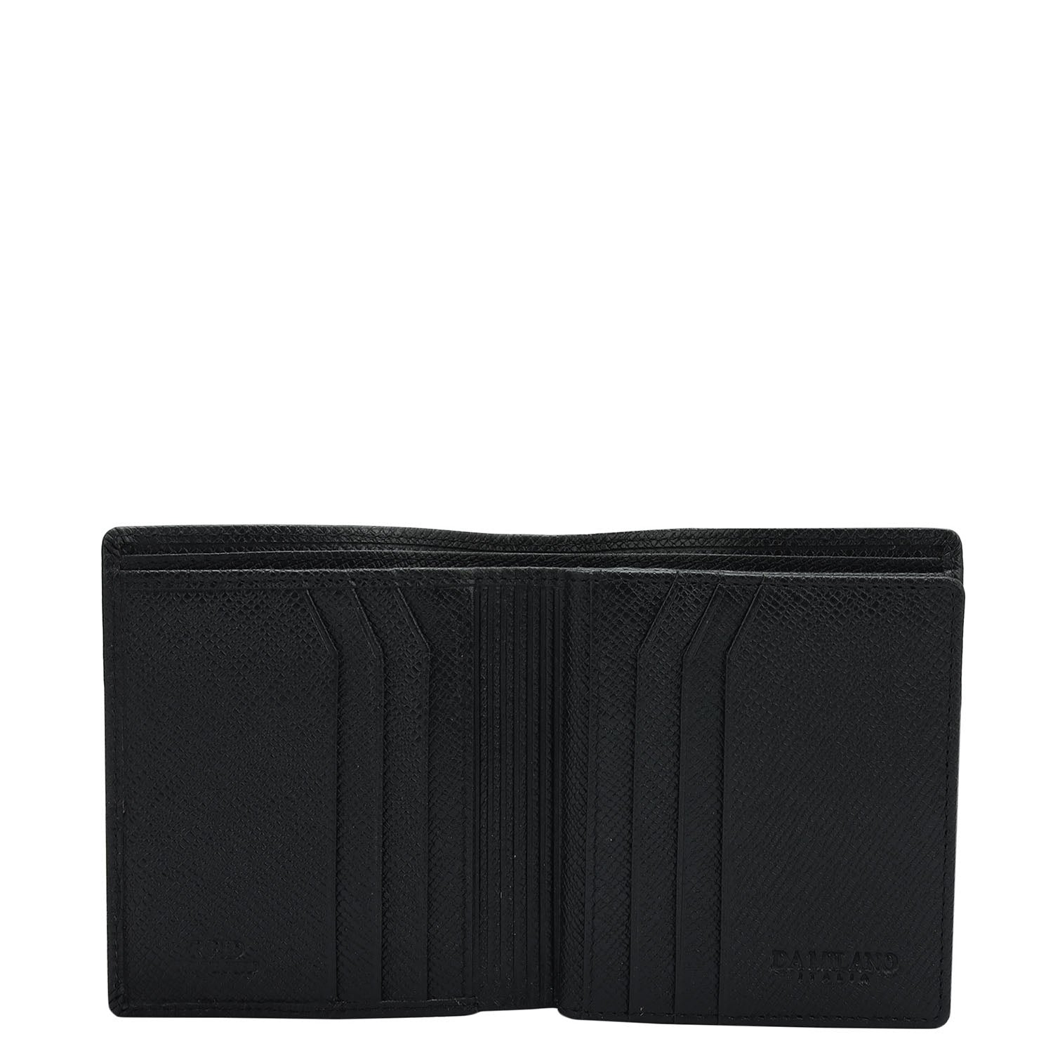 Crafted from textured leather, Da Milano men's bifold wallet offers a compact yet stylish design. Featuring easy-to-organize compartments, card slots, and pockets, it combines practicality with elegance. Subtle branding on the front enhances its refined appearance.