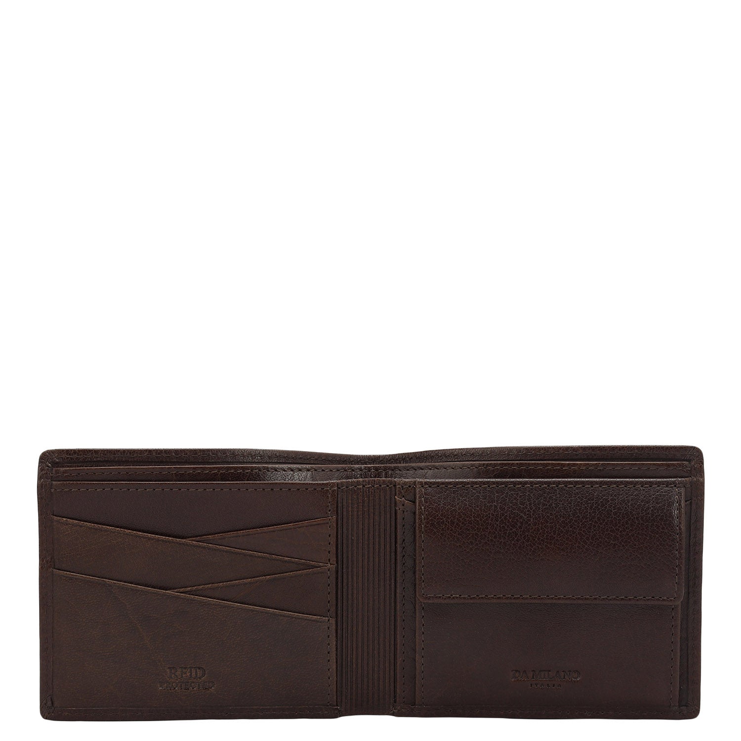 Crafted from textured leather, Da Milano men's bifold wallet offers a compact yet stylish design. Featuring easy-to-organize compartments, card slots, and pockets, it combines practicality with elegance. Subtle branding on the front enhances its refined appearance.