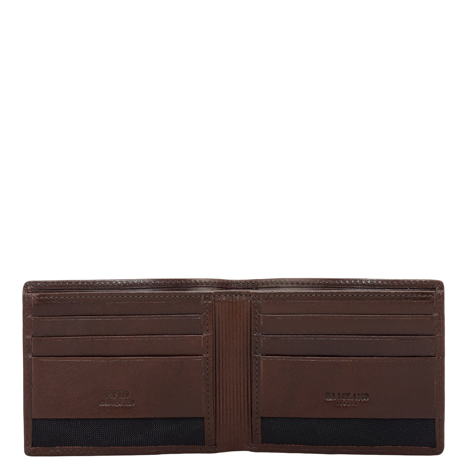 Crafted from textured leather, Da Milano men's bifold wallet offers a compact yet stylish design. Featuring easy-to-organize compartments, card slots, and pockets, it combines practicality with elegance. Subtle branding on the front enhances its refined appearance.