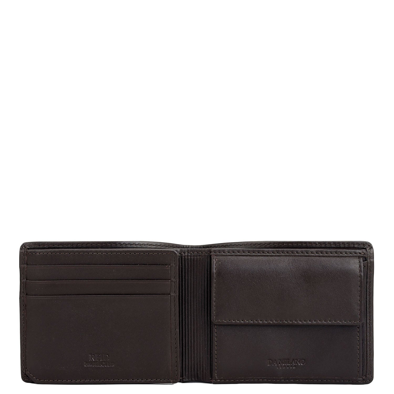 Crafted from textured leather, Da Milano men's bifold wallet offers a compact yet stylish design. Featuring easy-to-organize compartments, card slots, and pockets, it combines practicality with elegance. Subtle branding on the front enhances its refined appearance.