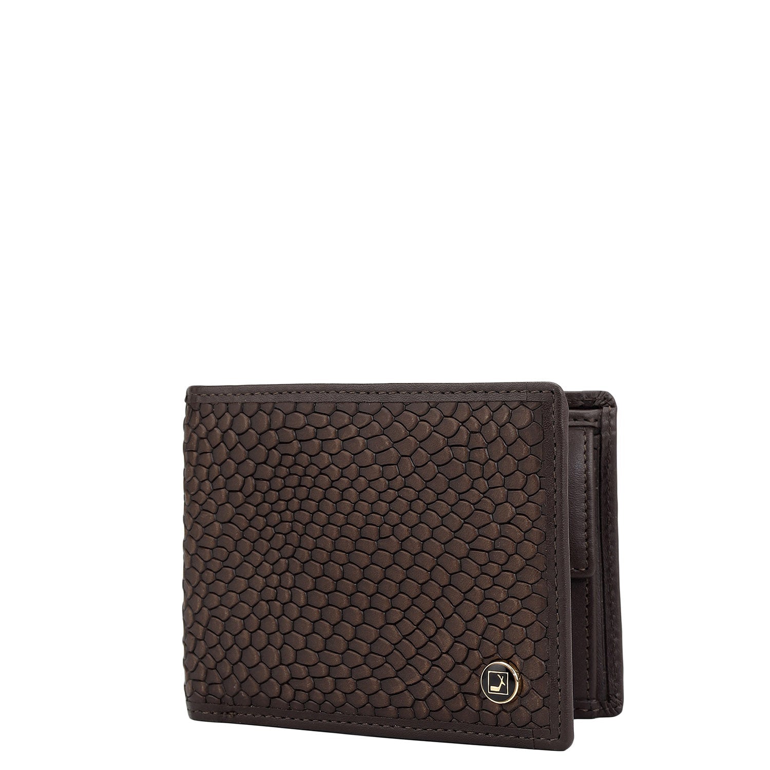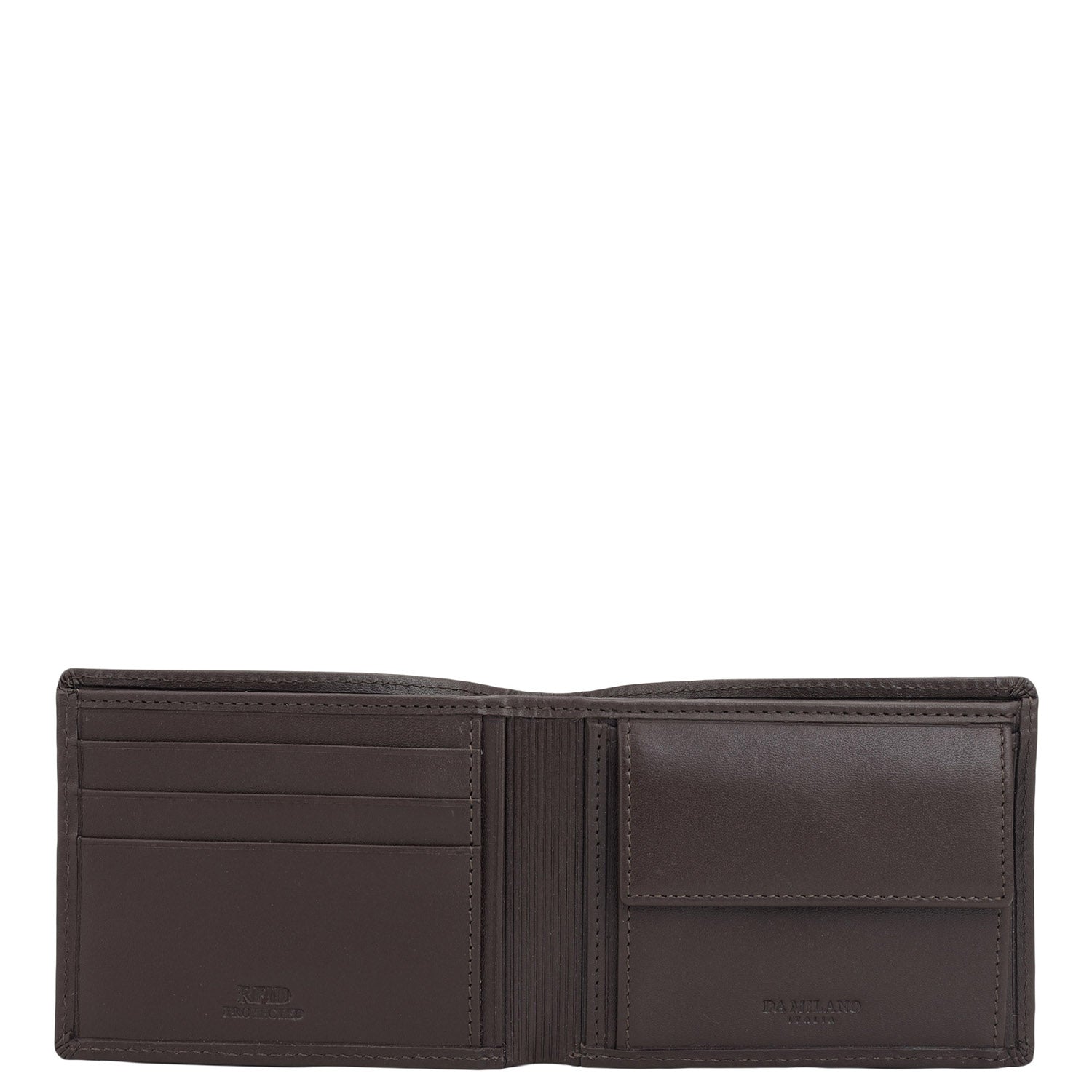 Crafted from textured leather, Da Milano men's bifold wallet offers a compact yet stylish design. Featuring easy-to-organize compartments, card slots, and pockets, it combines practicality with elegance. Subtle branding on the front enhances its refined appearance.