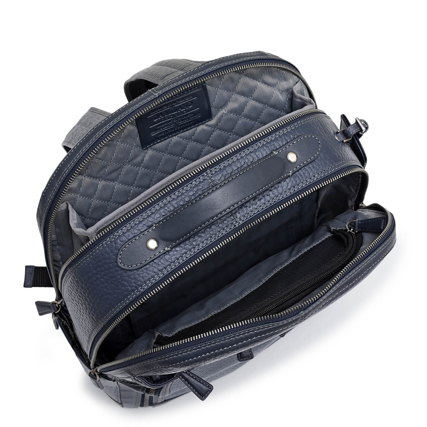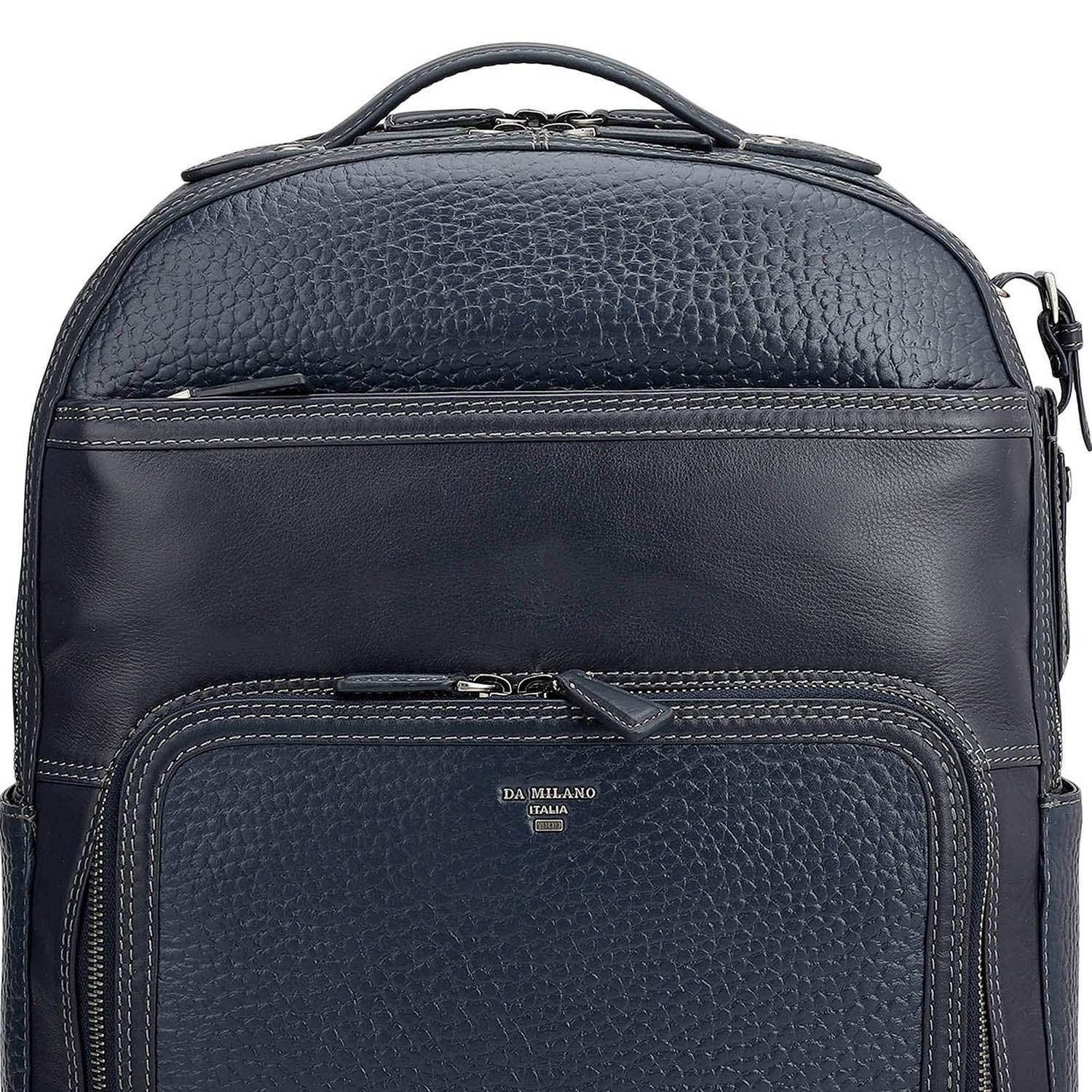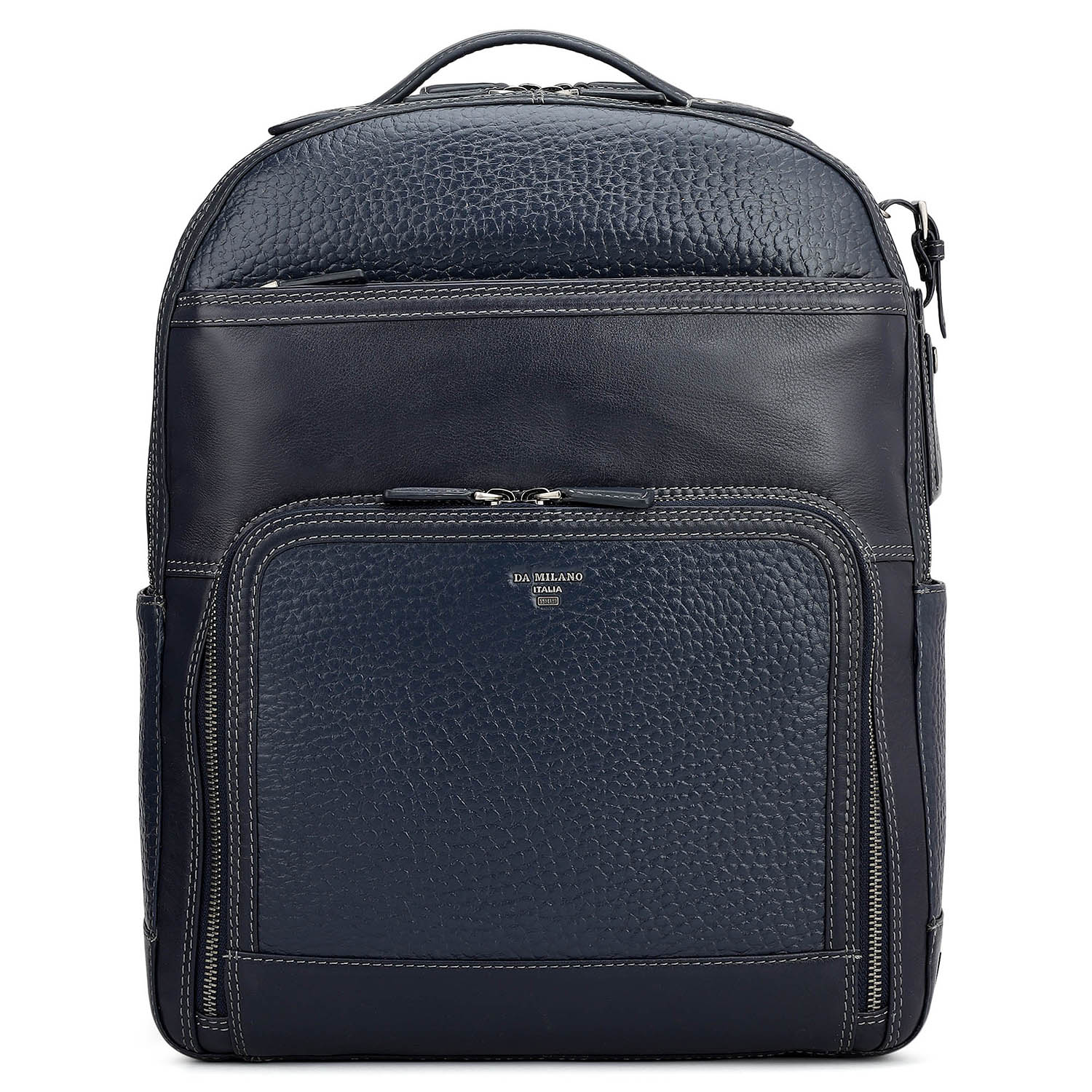 Leather backpack with a play of texture. Featuring multipurpose pockets on the exterior as well as interior to enhance utility. This functional bag is the perfect fusion of Italian craftsmanship and contemporary style. This bag can fit a standard laptop up to 15 inches.
