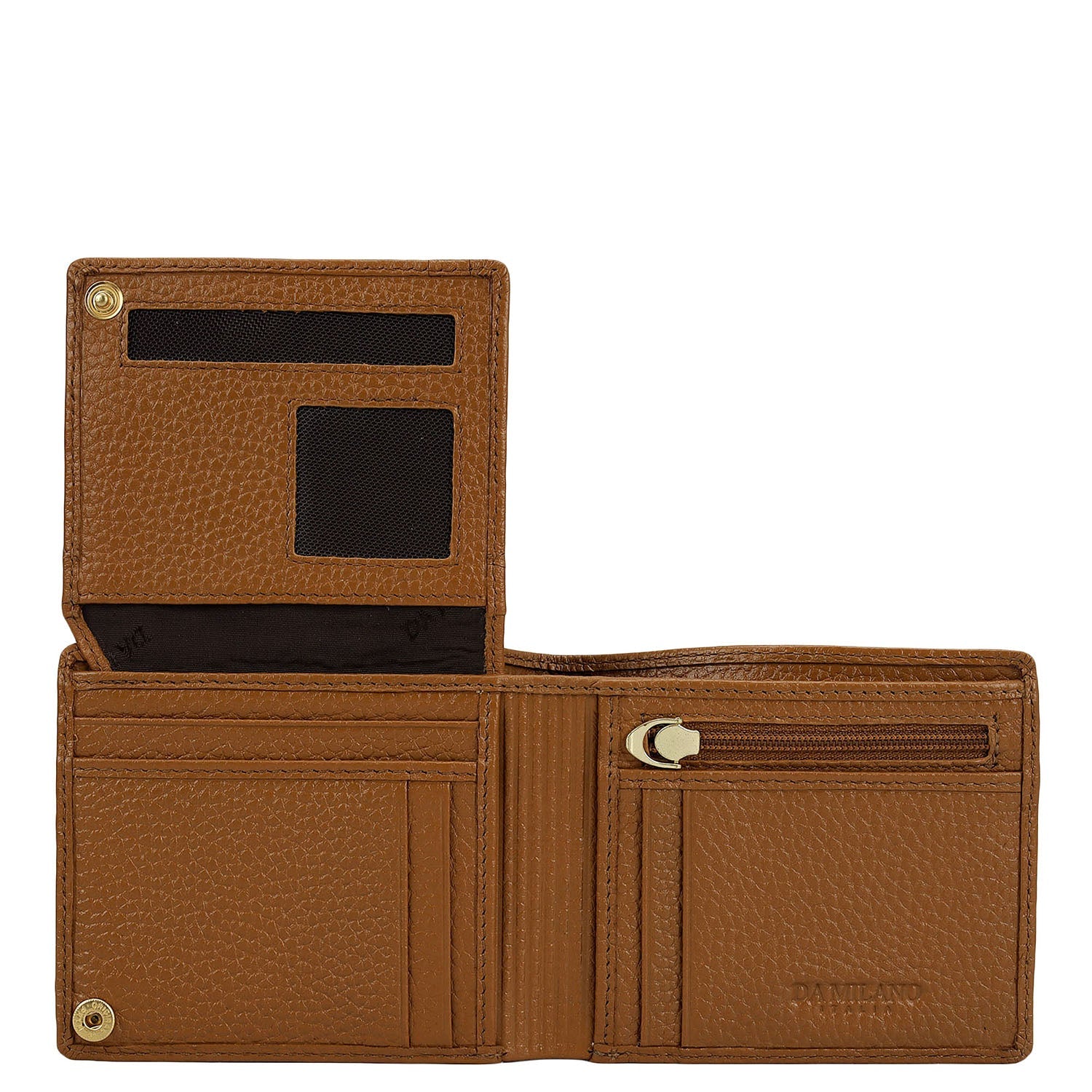 Crafted from textured leather, Da Milano men's bifold wallet offers a compact yet stylish design. Featuring easy-to-organize compartments, card slots, and pockets, it combines practicality with elegance. Subtle branding on the front enhances its refined appearance.