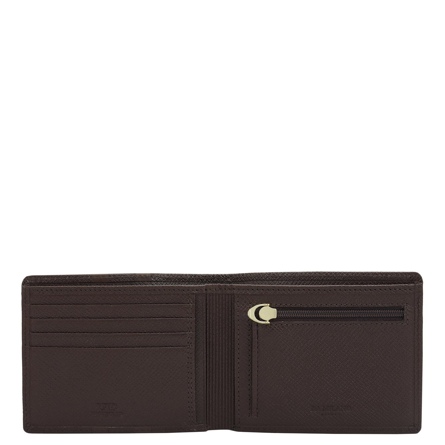 Crafted from textured leather, Da Milano men's bifold wallet offers a compact yet stylish design. Featuring easy-to-organize compartments, card slots, and pockets, it combines practicality with elegance. Subtle branding on the front enhances its refined appearance.