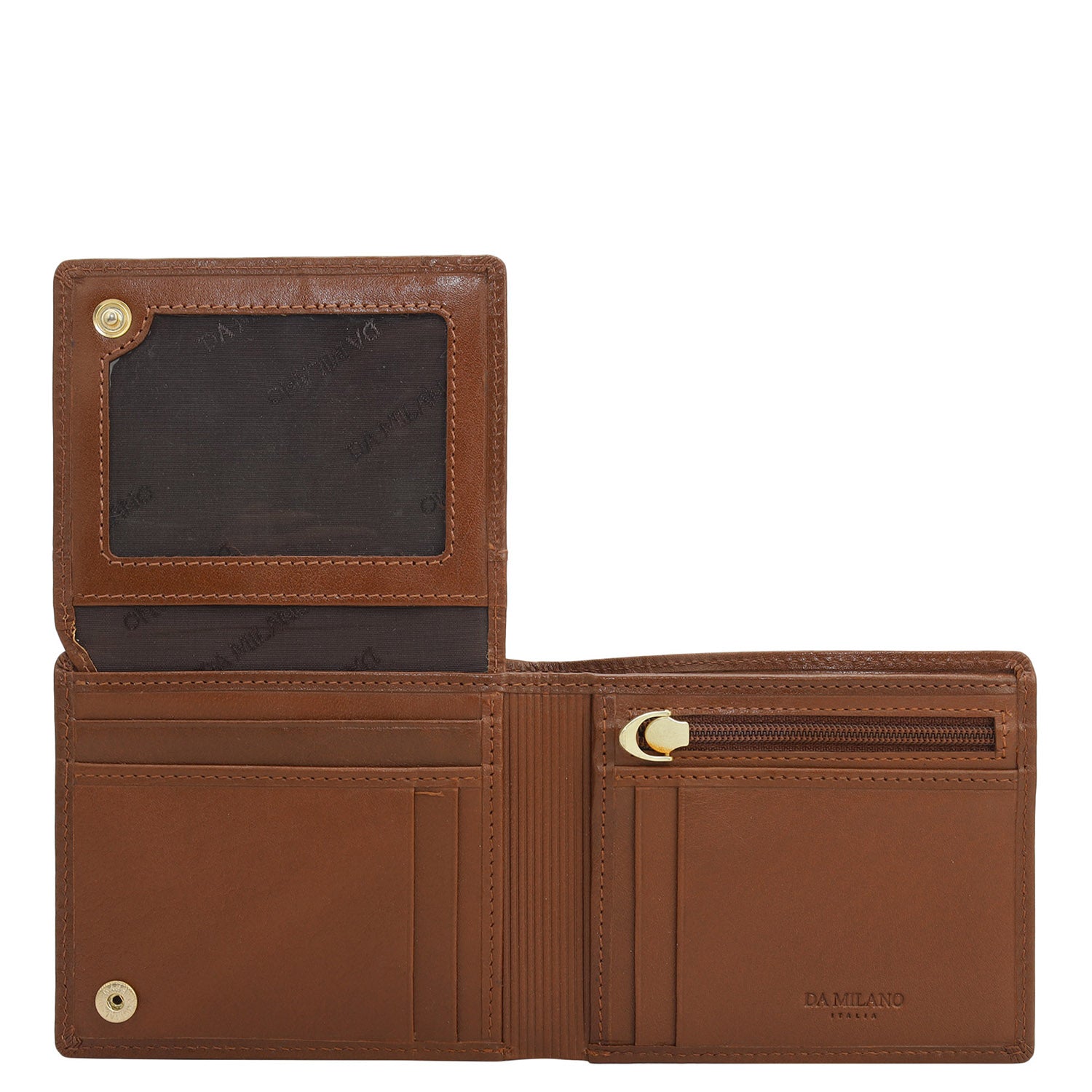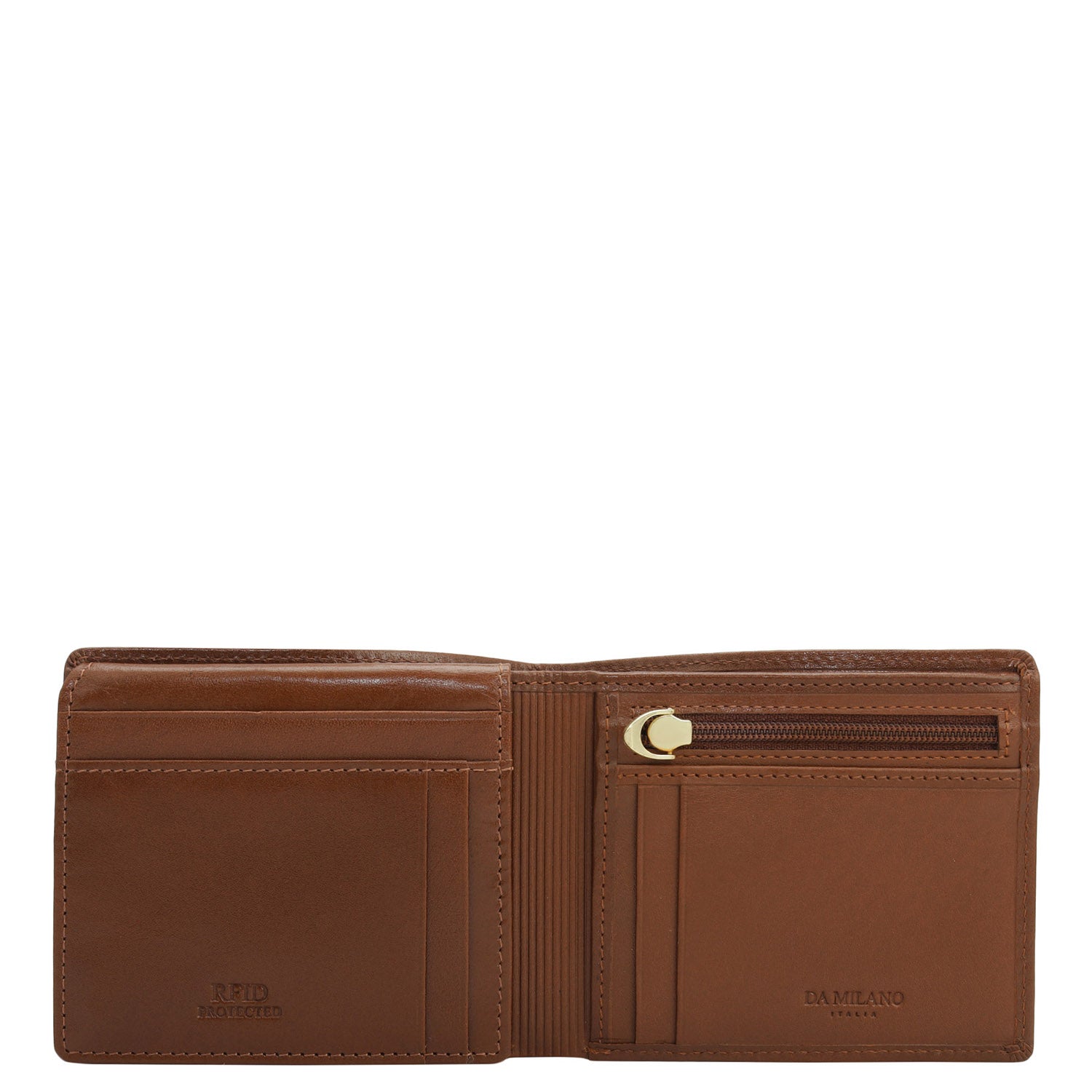 Crafted from textured leather, Da Milano men's bifold wallet offers a compact yet stylish design. Featuring easy-to-organize compartments, card slots, and pockets, it combines practicality with elegance. Subtle branding on the front enhances its refined appearance.