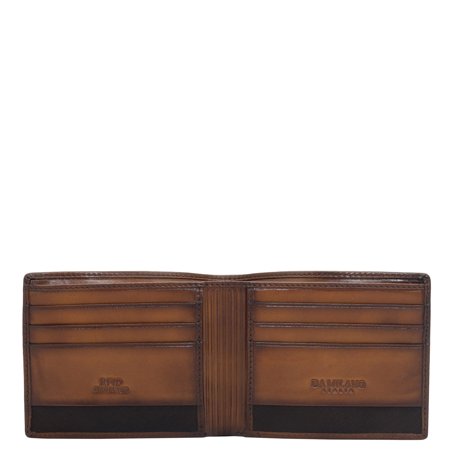 Crafted from textured leather, Da Milano men's bifold wallet offers a compact yet stylish design. Featuring easy-to-organize compartments, card slots, and pockets, it combines practicality with elegance. Subtle branding on the front enhances its refined appearance.