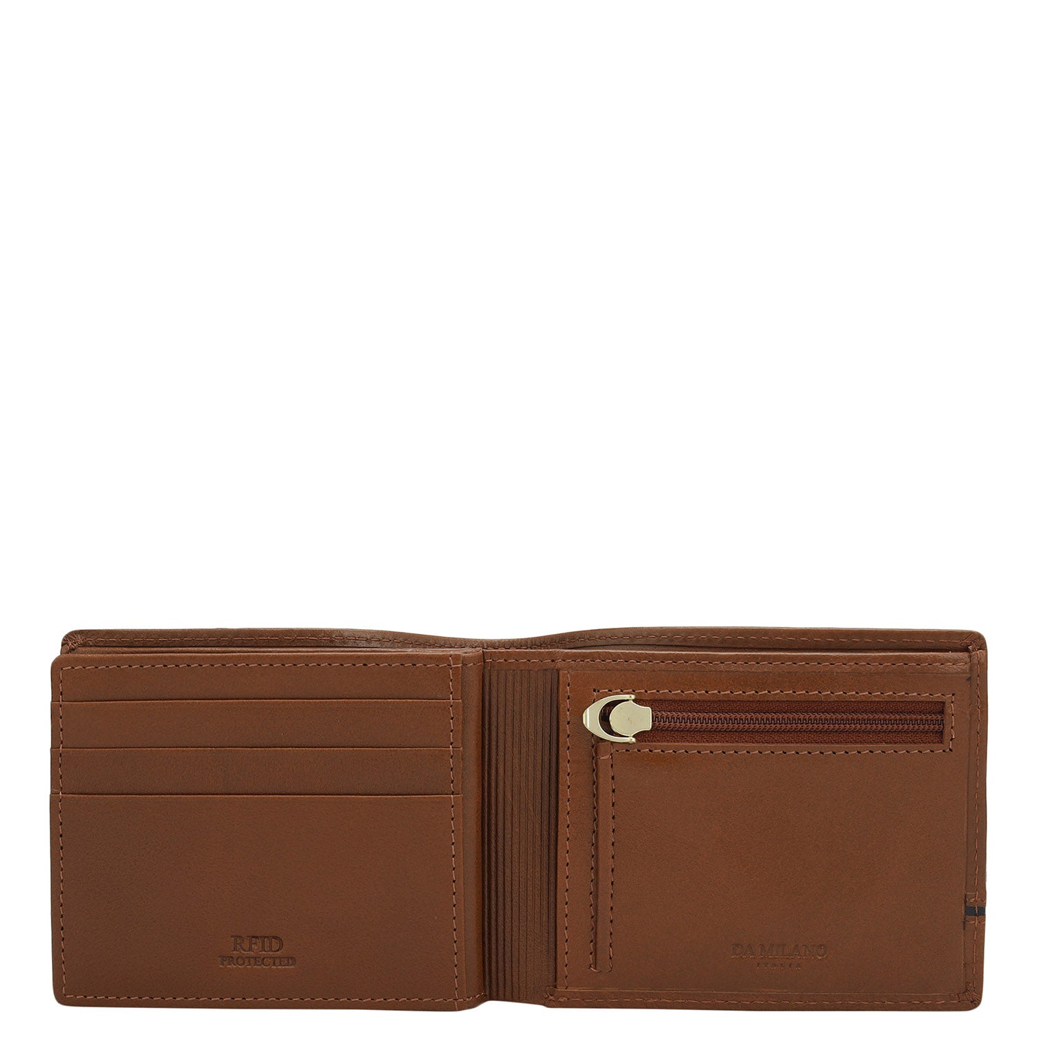 Crafted from textured leather, Da Milano men's bifold wallet offers a compact yet stylish design. Featuring easy-to-organize compartments, card slots, and pockets, it combines practicality with elegance. Subtle branding on the front enhances its refined appearance.
