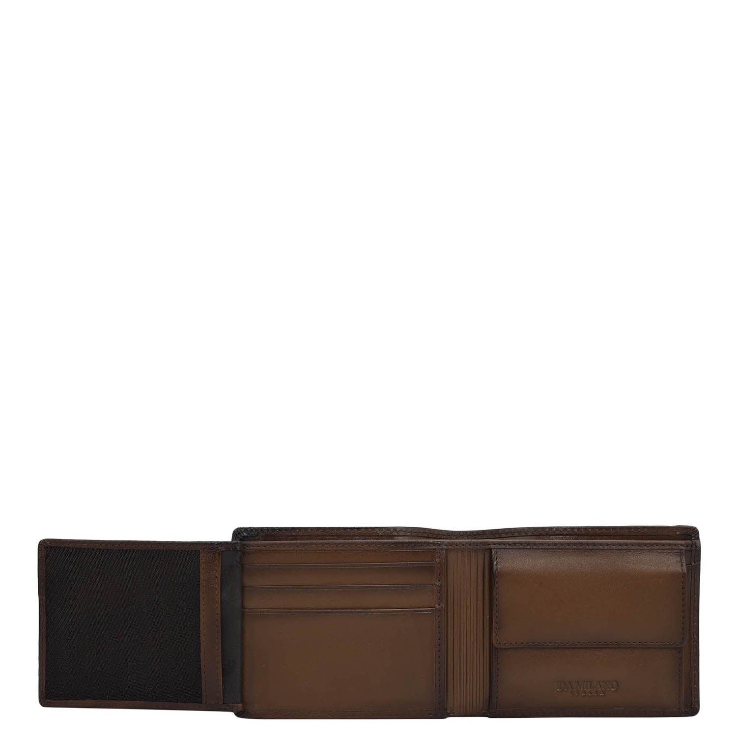 Crafted from textured leather, Da Milano men's bifold wallet offers a compact yet stylish design. Featuring easy-to-organize compartments, card slots, and pockets, it combines practicality with elegance. Subtle branding on the front enhances its refined appearance.