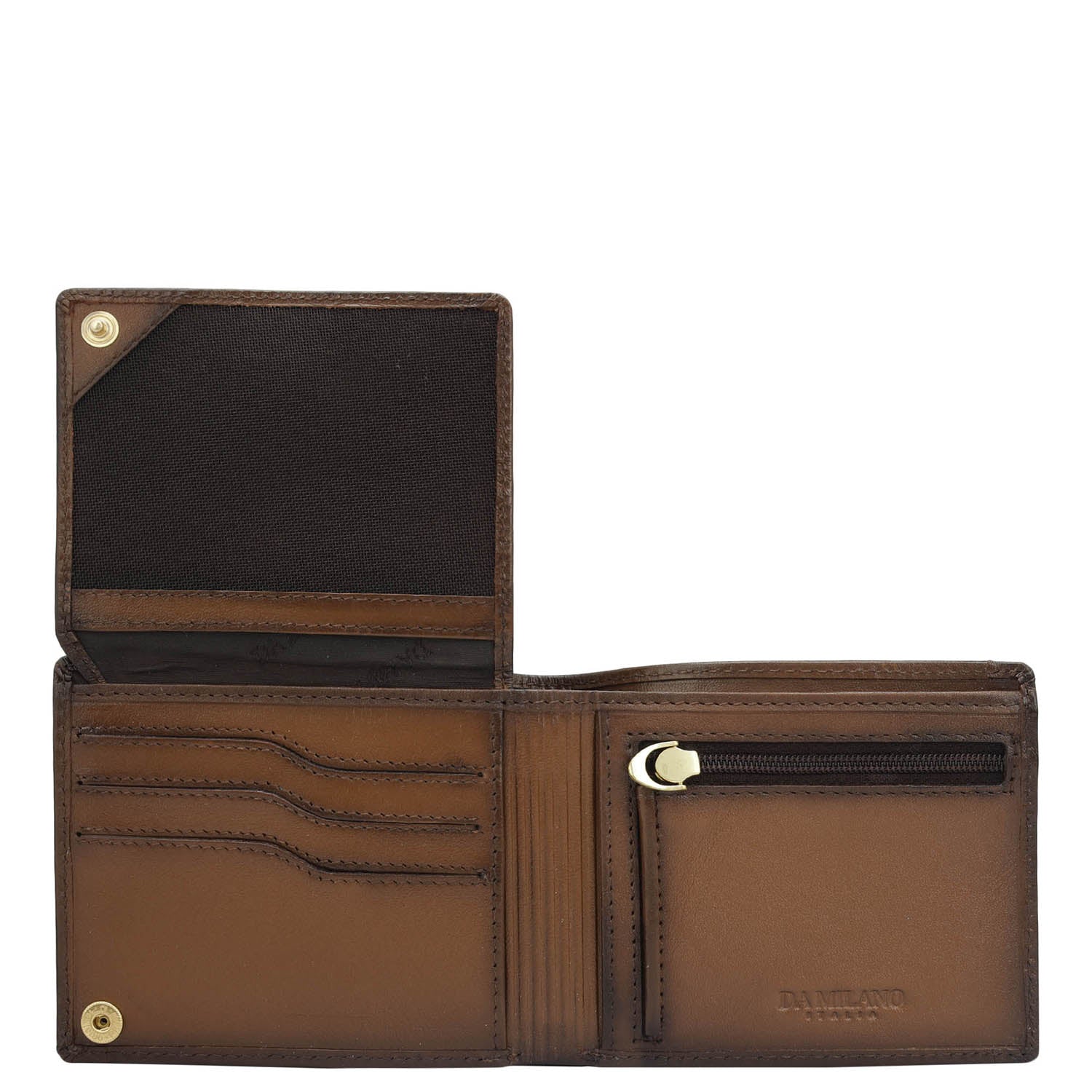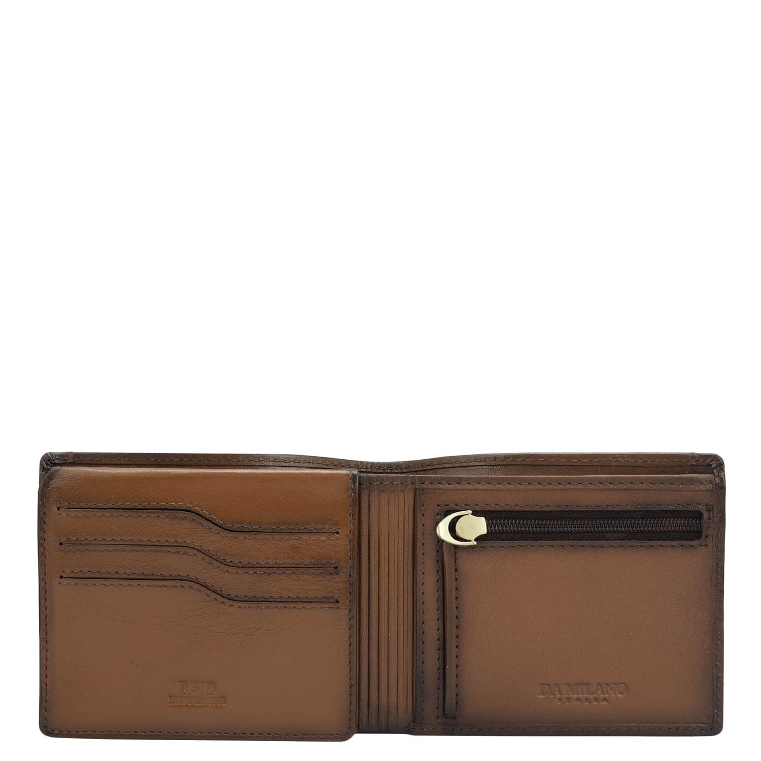Crafted from textured leather, Da Milano men's bifold wallet offers a compact yet stylish design. Featuring easy-to-organize compartments, card slots, and pockets, it combines practicality with elegance. Subtle branding on the front enhances its refined appearance.