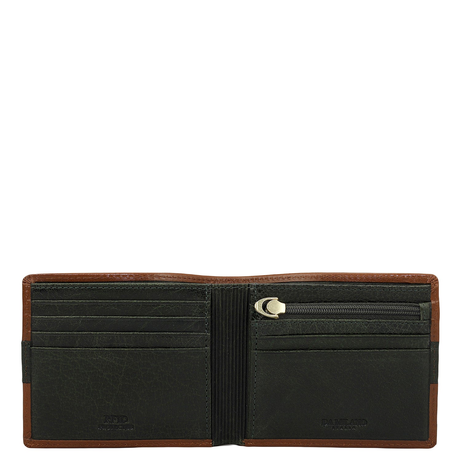 Crafted from textured leather, Da Milano men's bifold wallet offers a compact yet stylish design. Featuring easy-to-organize compartments, card slots, and pockets, it combines practicality with elegance. Subtle branding on the front enhances its refined appearance.
