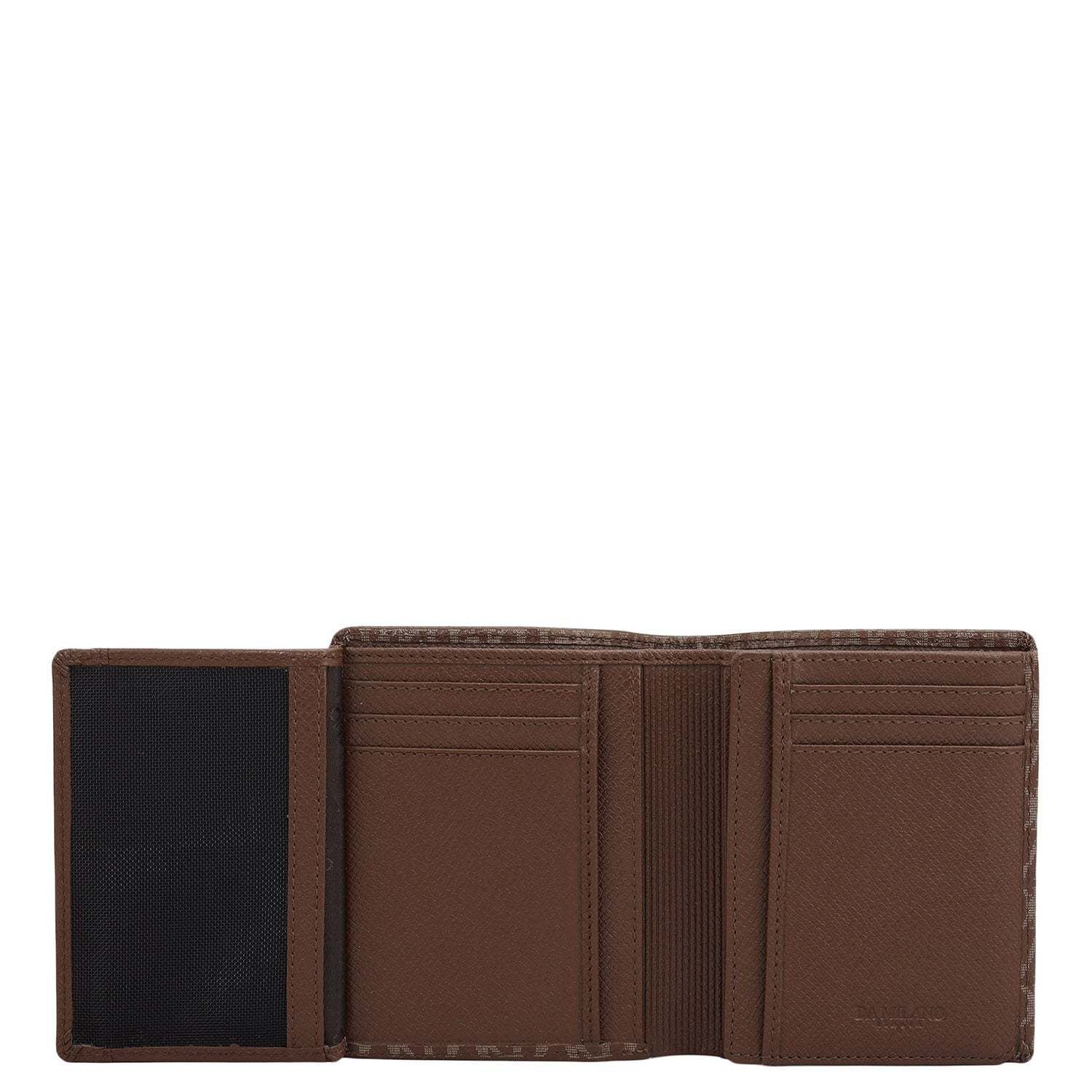 Crafted from textured leather, Da Milano men's bifold wallet offers a compact yet stylish design. Featuring easy-to-organize compartments, card slots, and pockets, it combines practicality with elegance. Subtle branding on the front enhances its refined appearance.