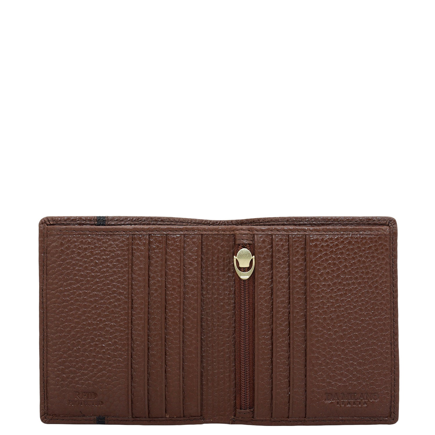 Crafted from textured leather, Da Milano men's bifold wallet offers a compact yet stylish design. Featuring easy-to-organize compartments, card slots, and pockets, it combines practicality with elegance. Subtle branding on the front enhances its refined appearance.