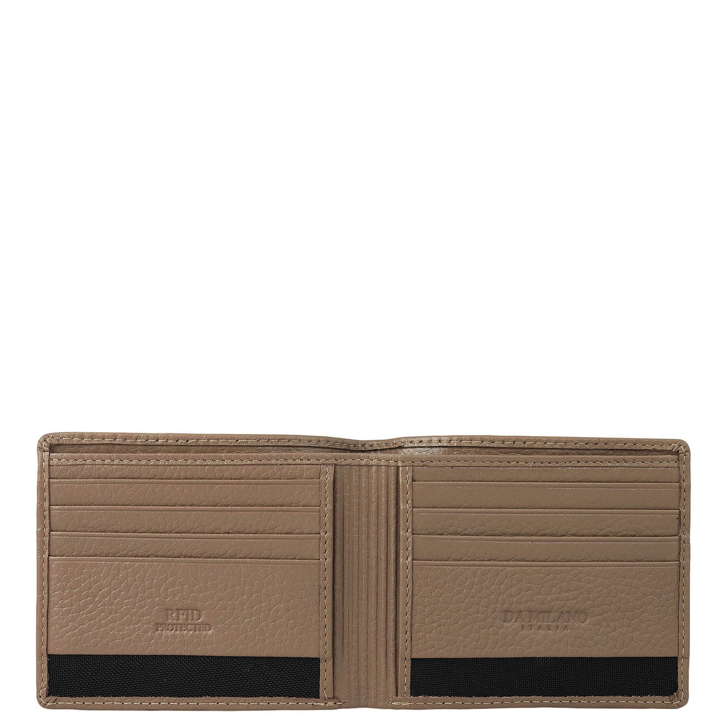 Crafted from textured leather, Da Milano men's bifold wallet offers a compact yet stylish design. Featuring easy-to-organize compartments, card slots, and pockets, it combines practicality with elegance. Subtle branding on the front enhances its refined appearance.