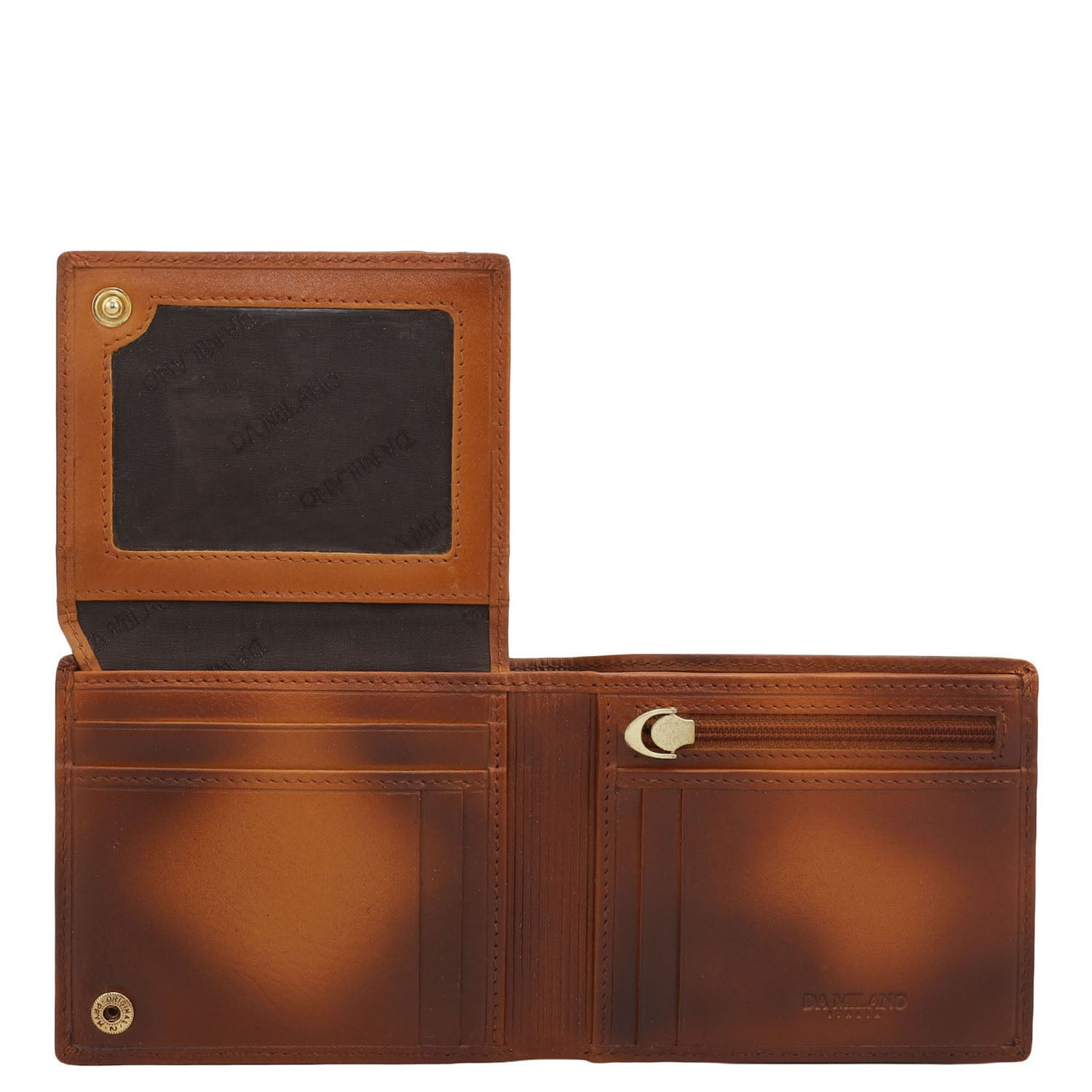 Crafted from textured leather, Da Milano men's bifold wallet offers a compact yet stylish design. Featuring easy-to-organize compartments, card slots, and pockets, it combines practicality with elegance. Subtle branding on the front enhances its refined appearance.