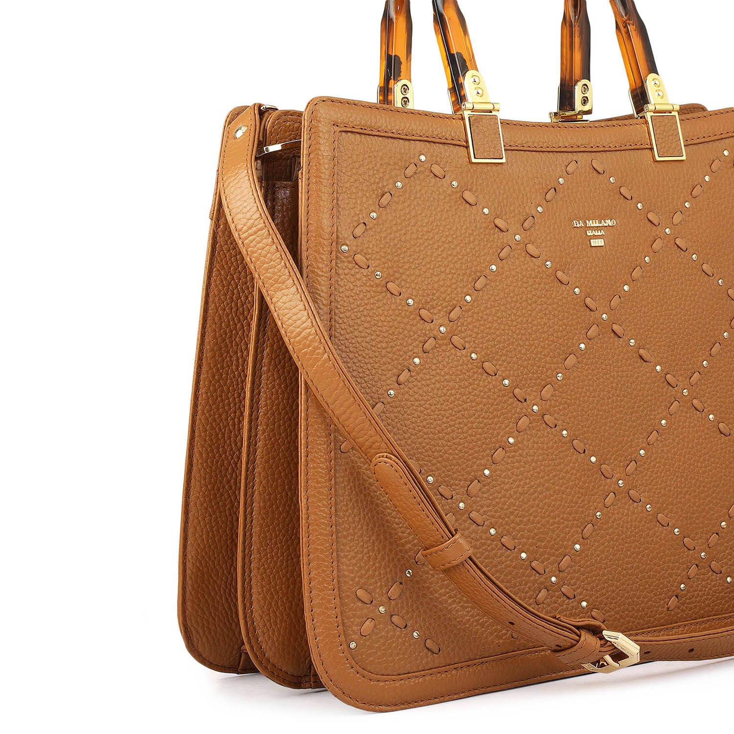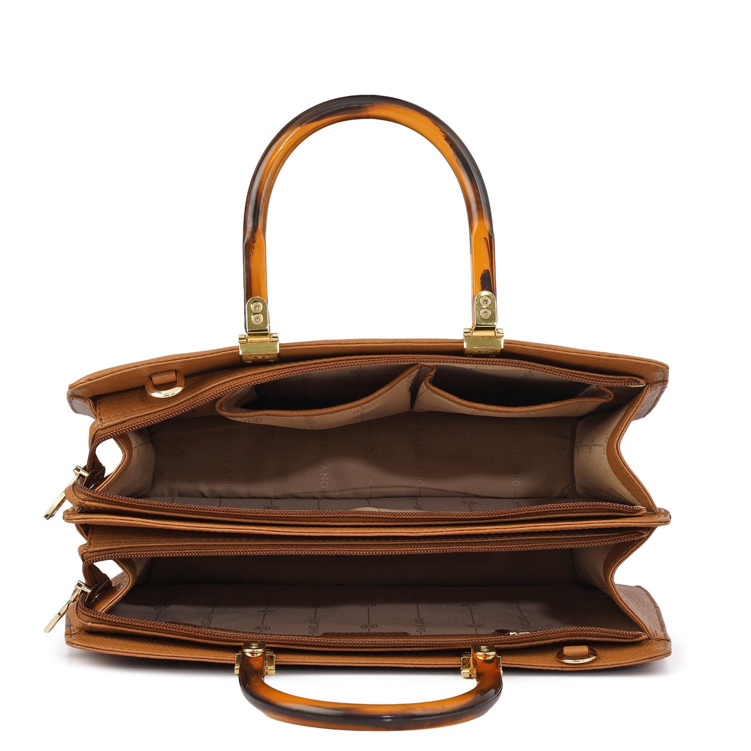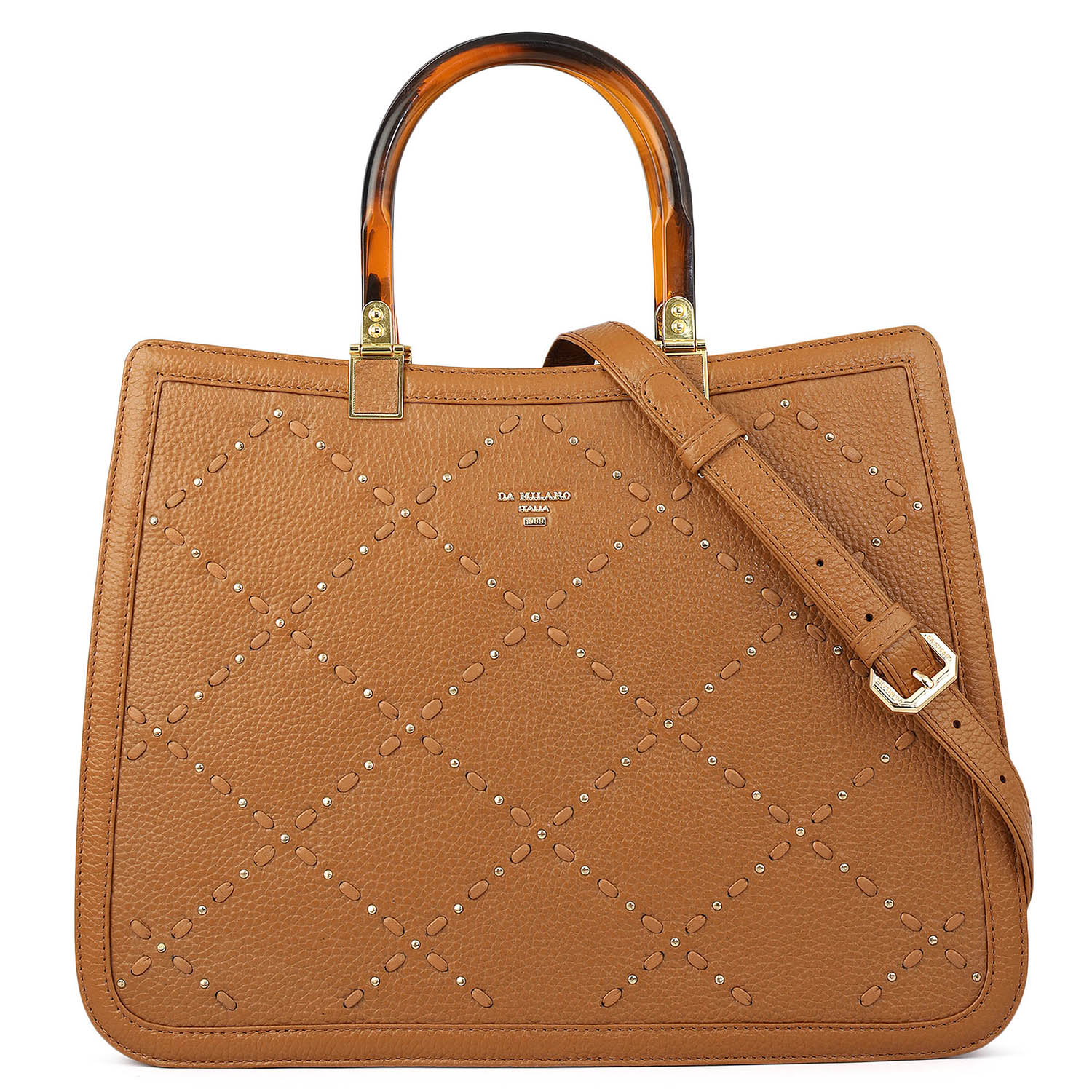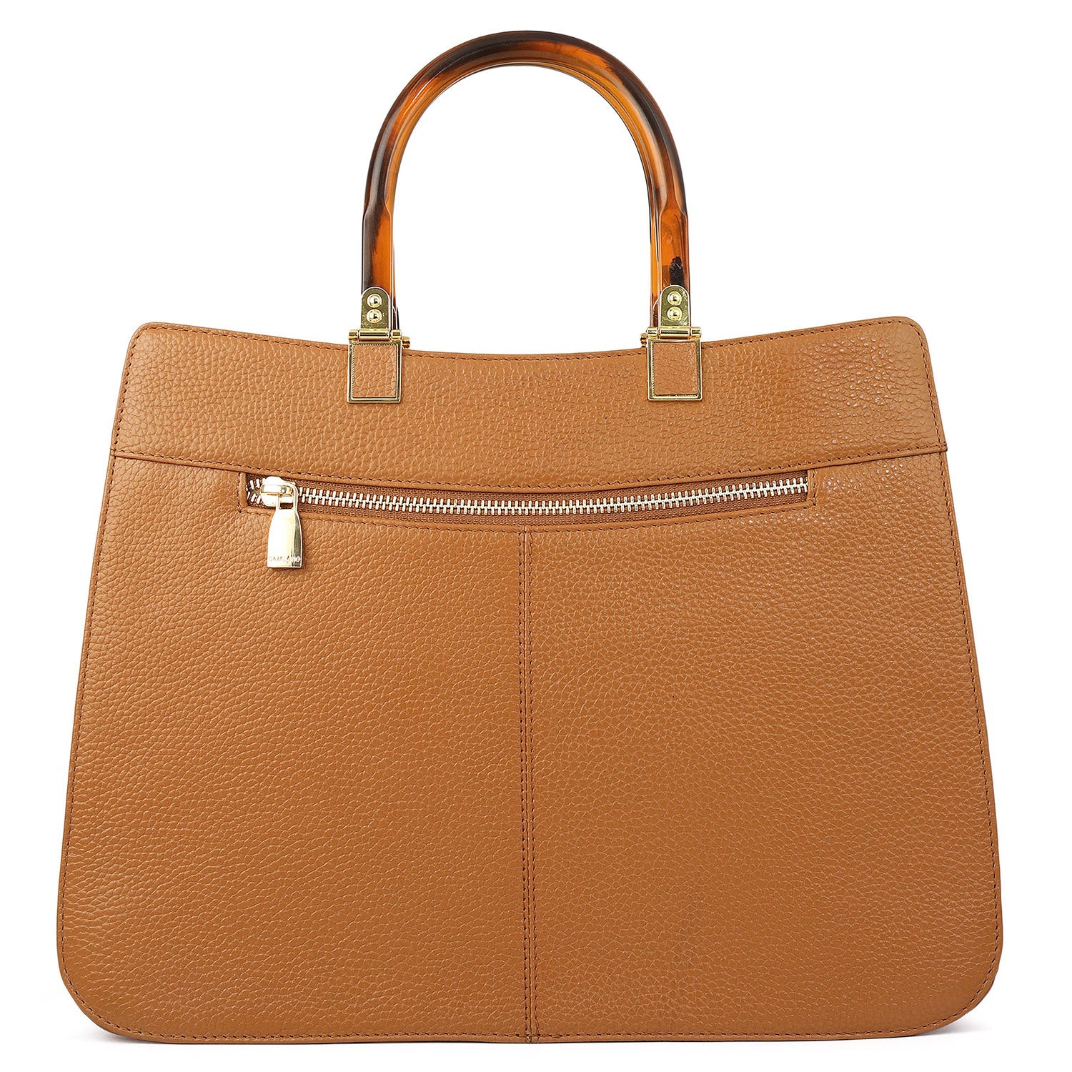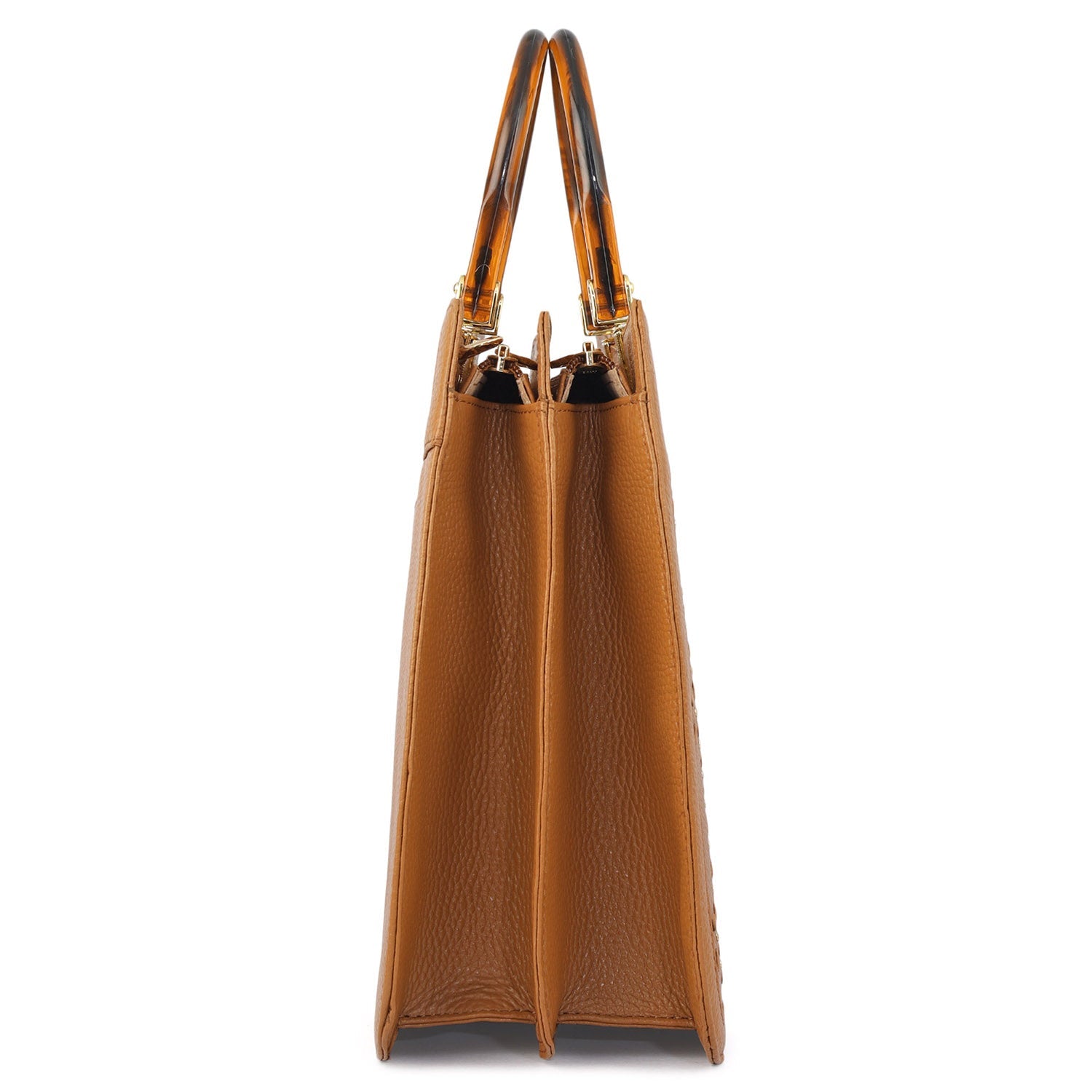 Classic structure meets contemporary detail in this Structured Top Handle Bag. Defined by the collection’s hand-laced diamond pattern and rivet embellishments, this silhouette is elevated further with sleek acrylic handles that add a modern, sculptural touch. The soft wax leather offers rich pebble texture, while the spacious interior and zip-top closure provide practicality for everyday carry. Polished yet distinctive, this tote is designed for those who appreciate craftsmanship with a hint of boldness.