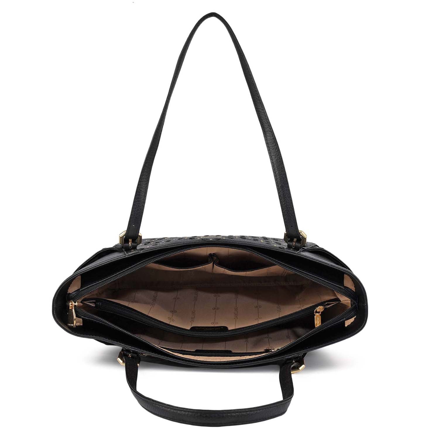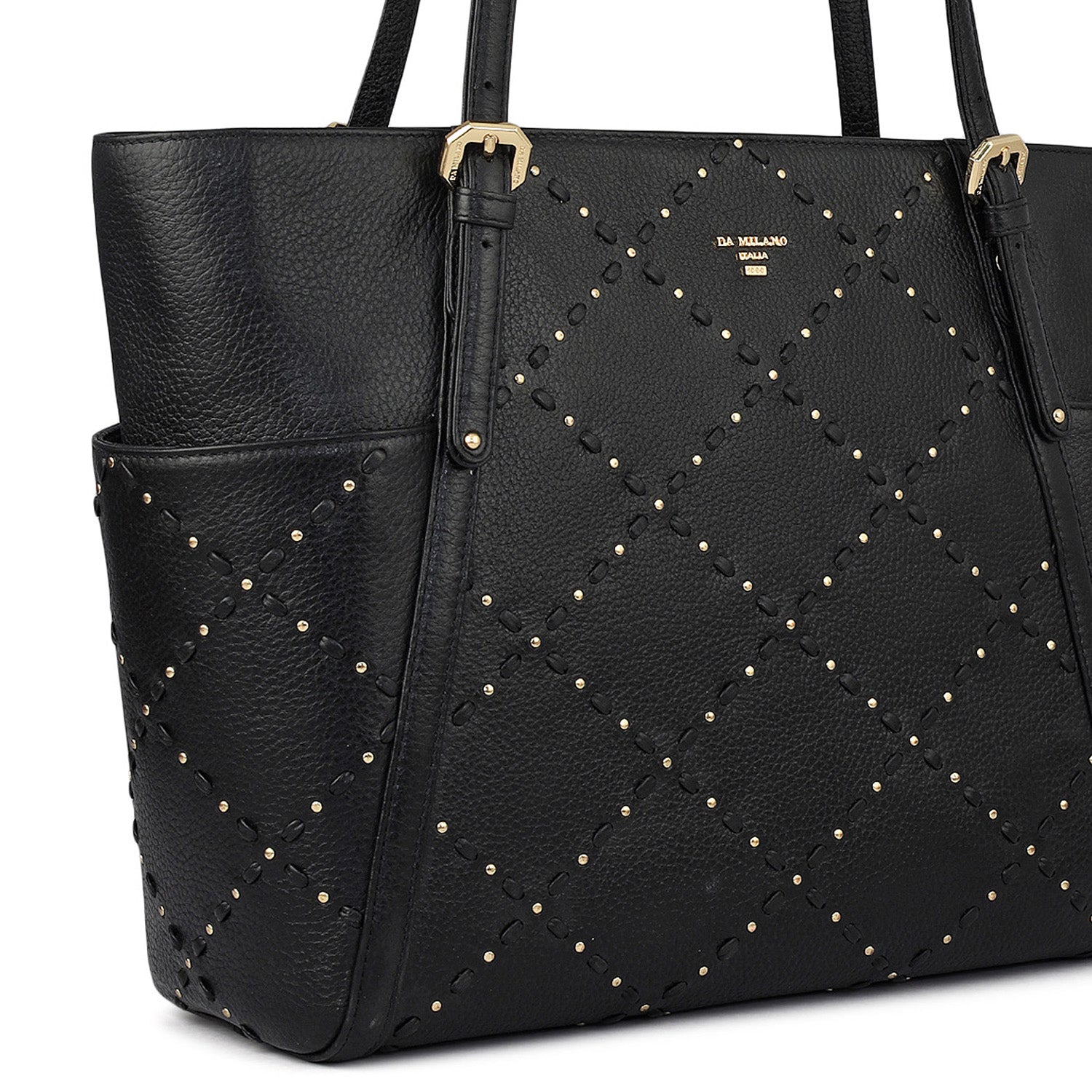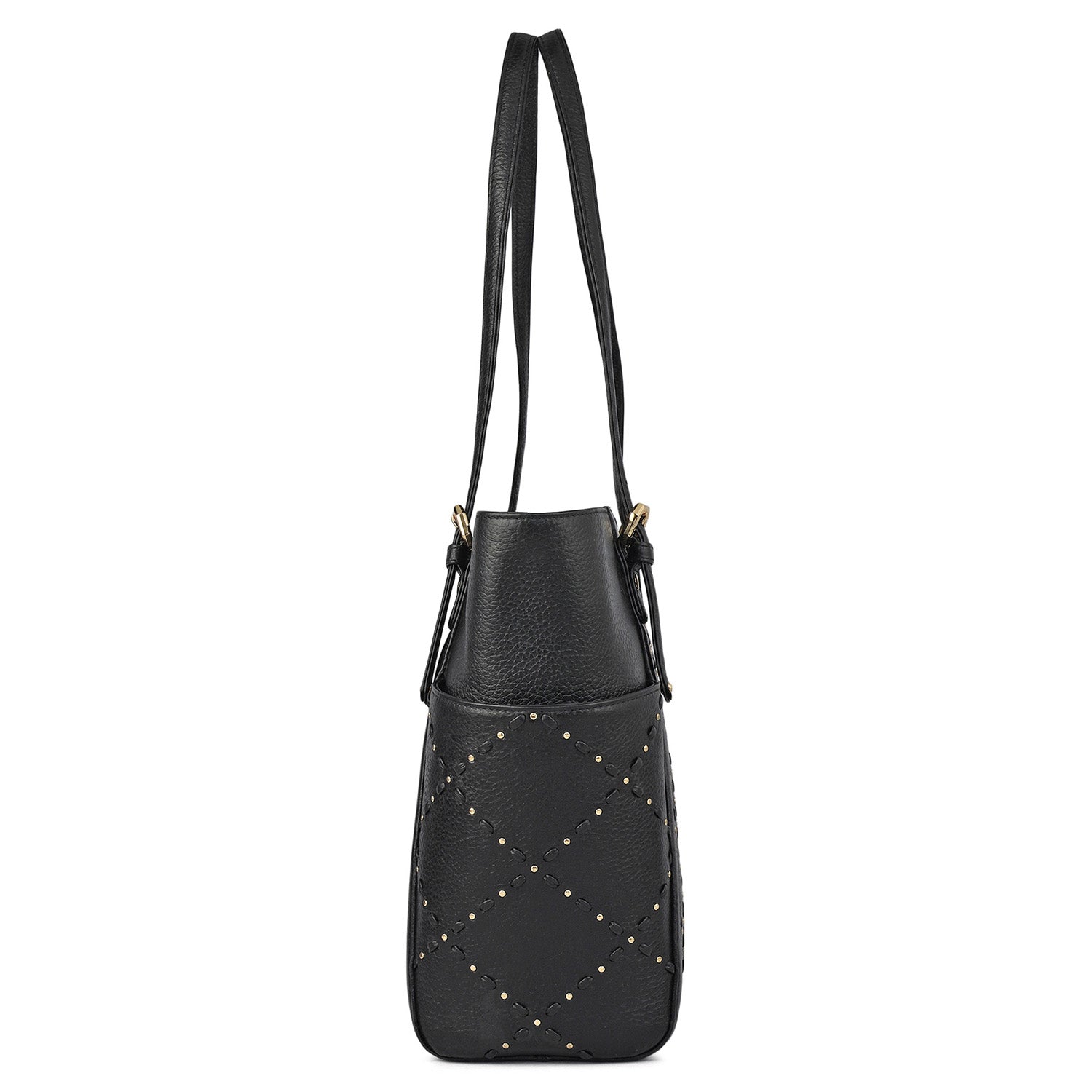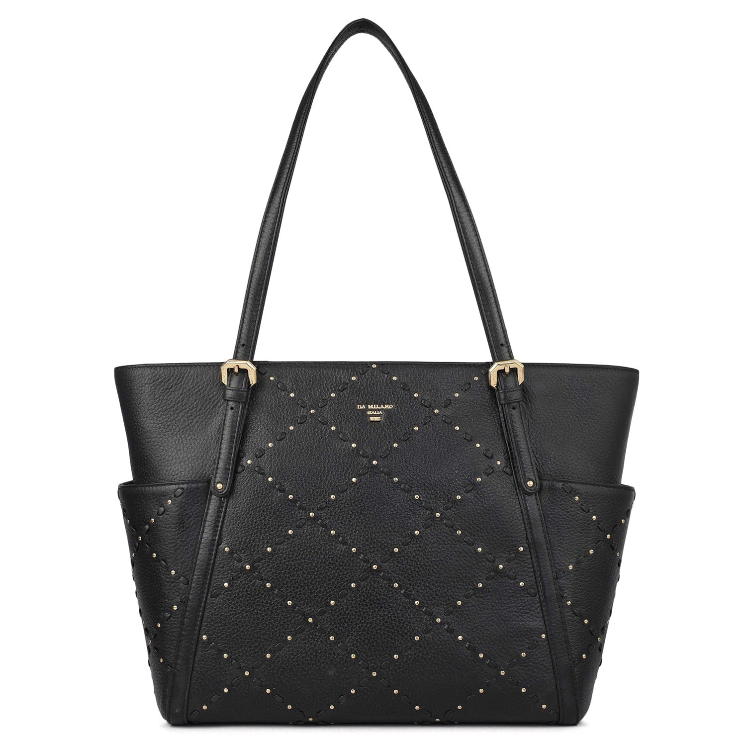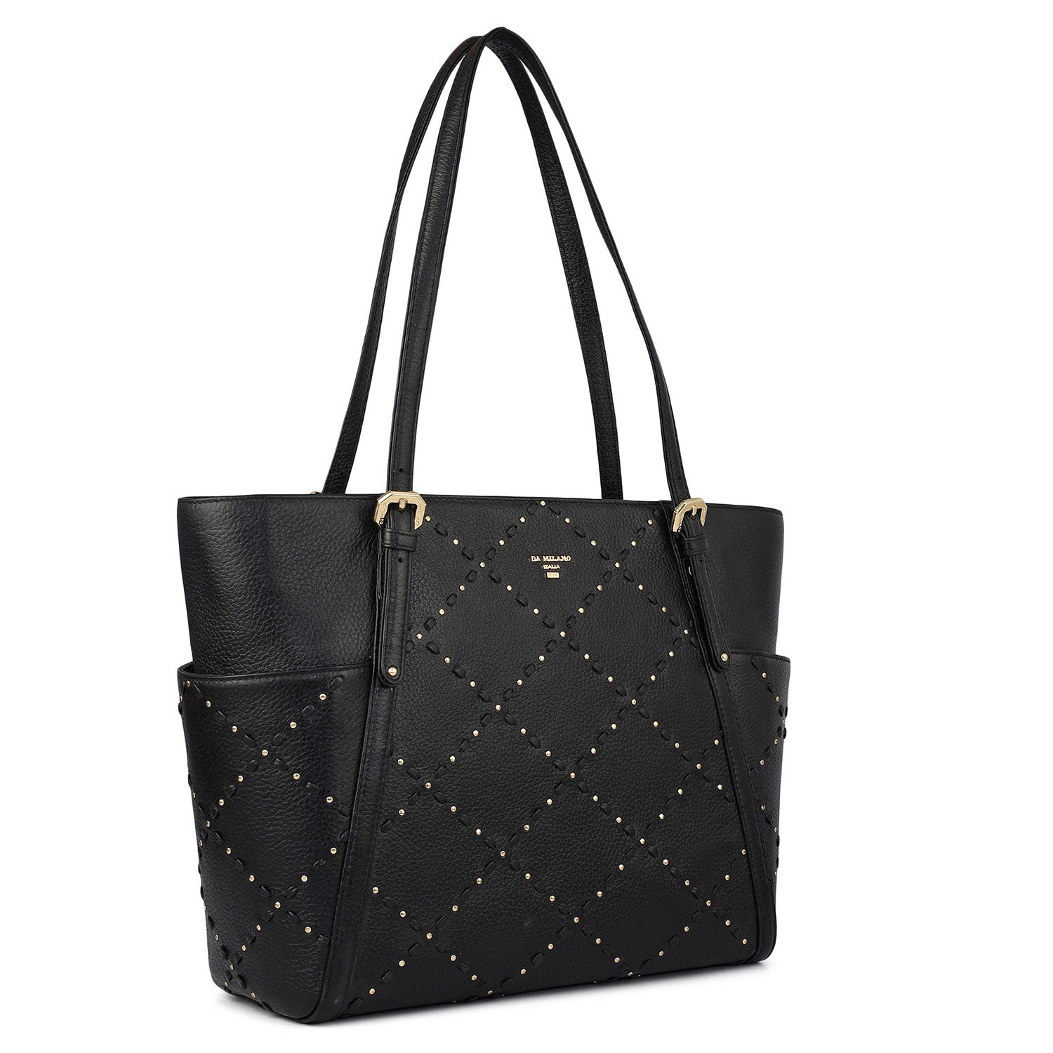 Roomy, refined, and rich in detail, this Shopper is crafted for the woman who carries it all — and carries it well. Featuring the collection’s signature hand-laced diamond pattern with rivet accents, it blends everyday function with artisan finesse. The structured silhouette opens to two spacious compartments, designed to keep essentials sorted with ease. Multiple interior and exterior pockets offer smart storage, while long, adjustable handles ensure all-day comfort. Whether for work, errands, or travel, this Shopper brings handcrafted elegance to your busiest days.