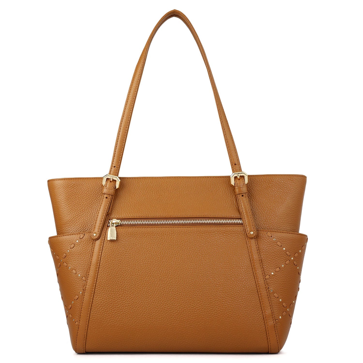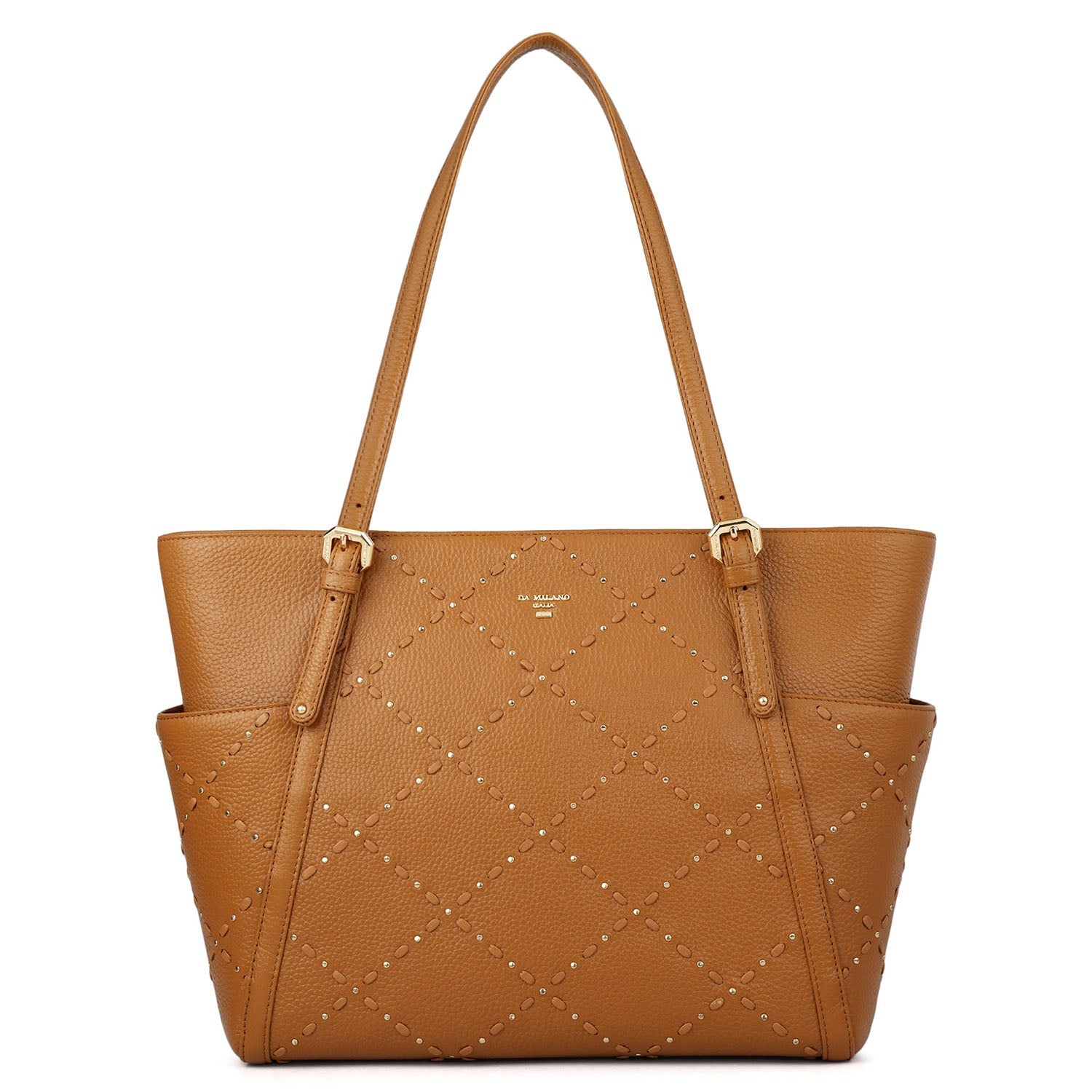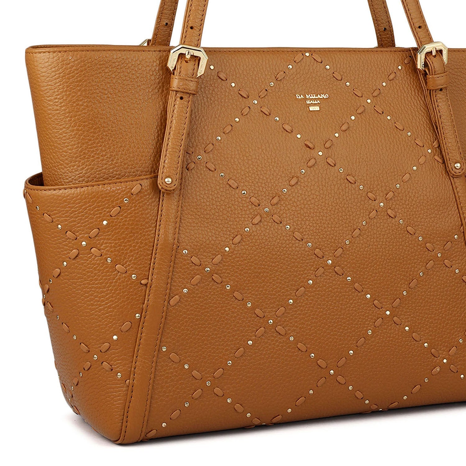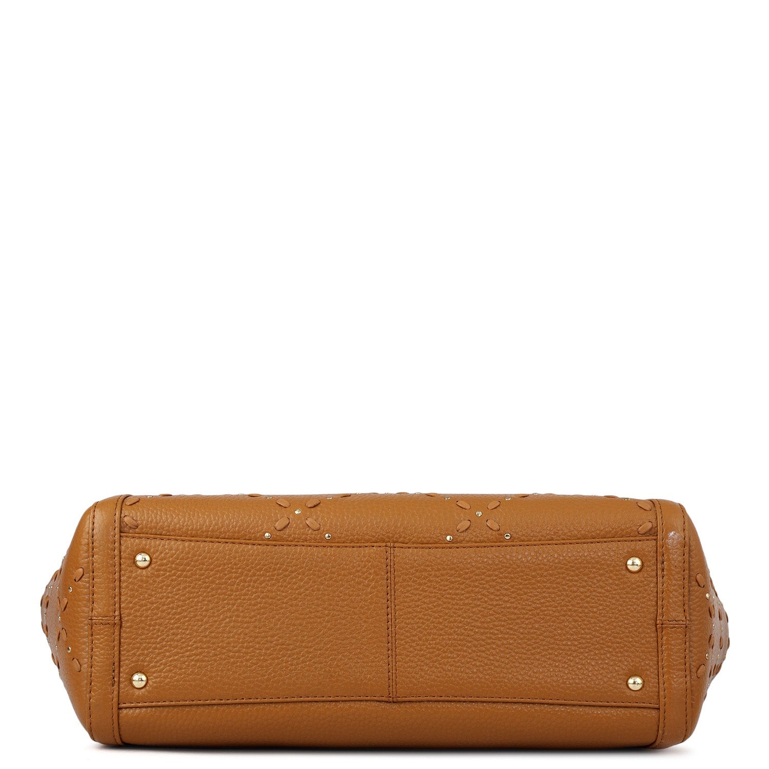 Roomy, refined, and rich in detail, this Shopper is crafted for the woman who carries it all — and carries it well. Featuring the collection’s signature hand-laced diamond pattern with rivet accents, it blends everyday function with artisan finesse. The structured silhouette opens to two spacious compartments, designed to keep essentials sorted with ease. Multiple interior and exterior pockets offer smart storage, while long, adjustable handles ensure all-day comfort. Whether for work, errands, or travel, this Shopper brings handcrafted elegance to your busiest days.