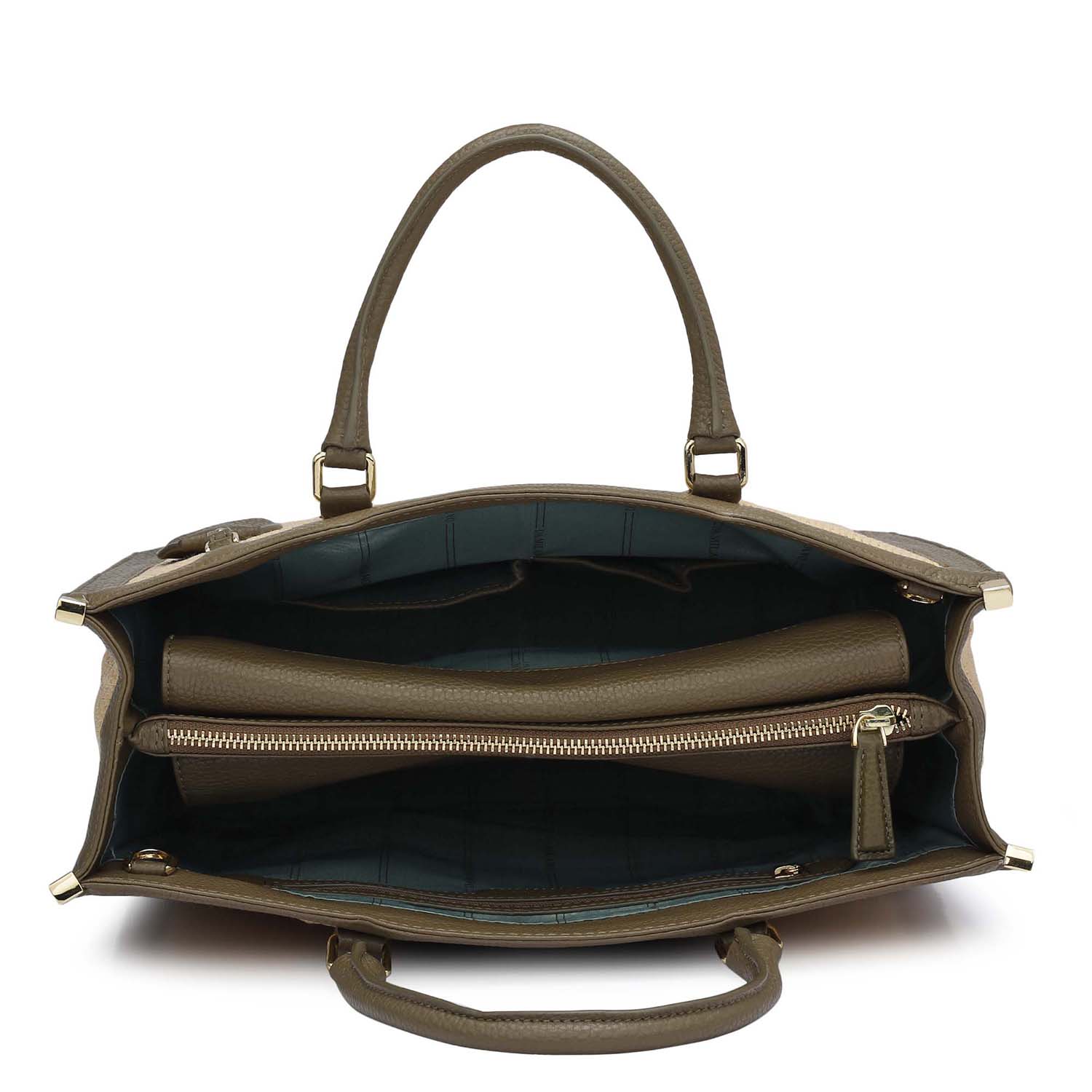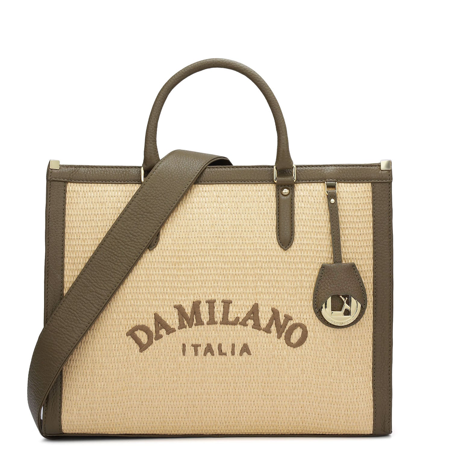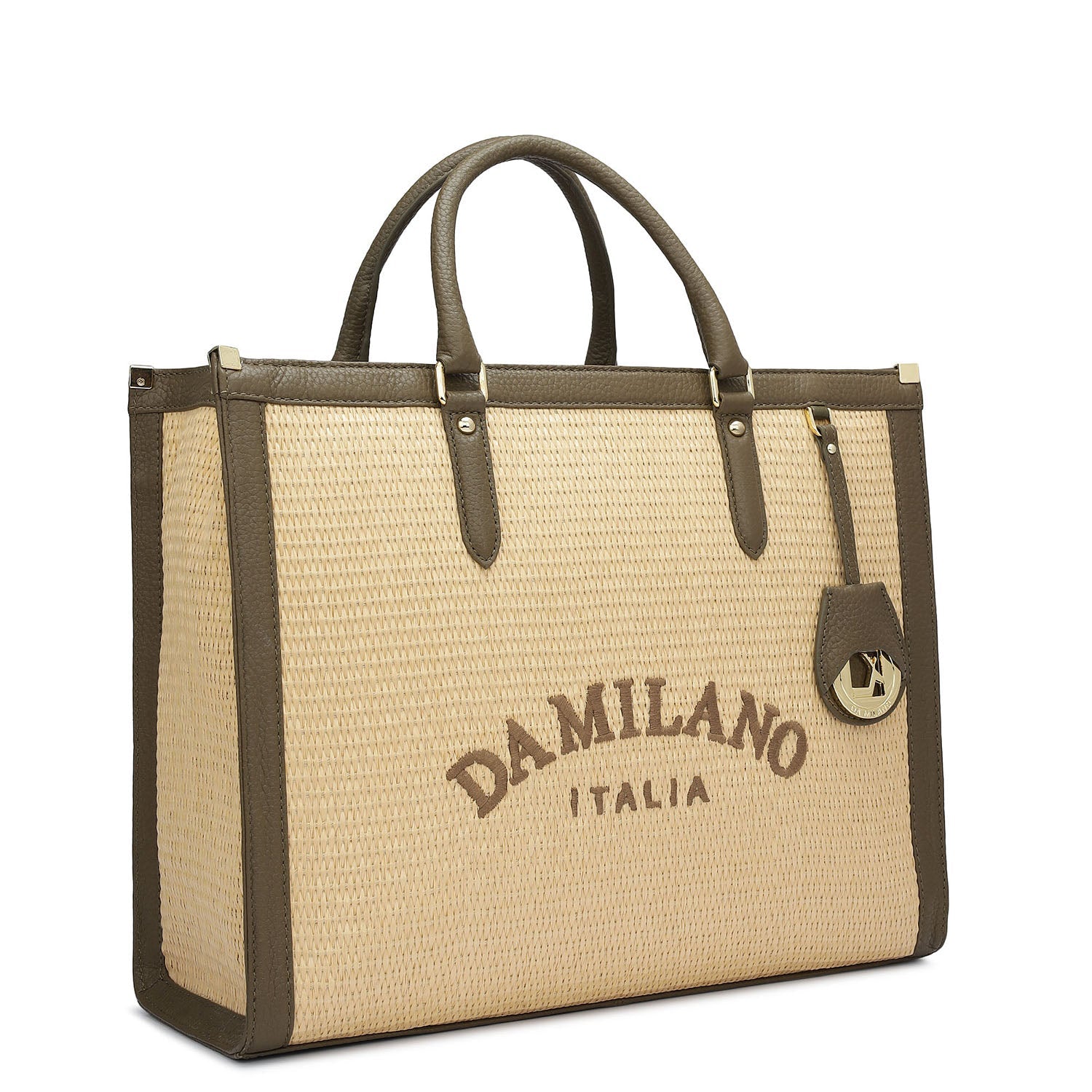 Medium Raffia Wax Leather Book Tote - Beige & Moss