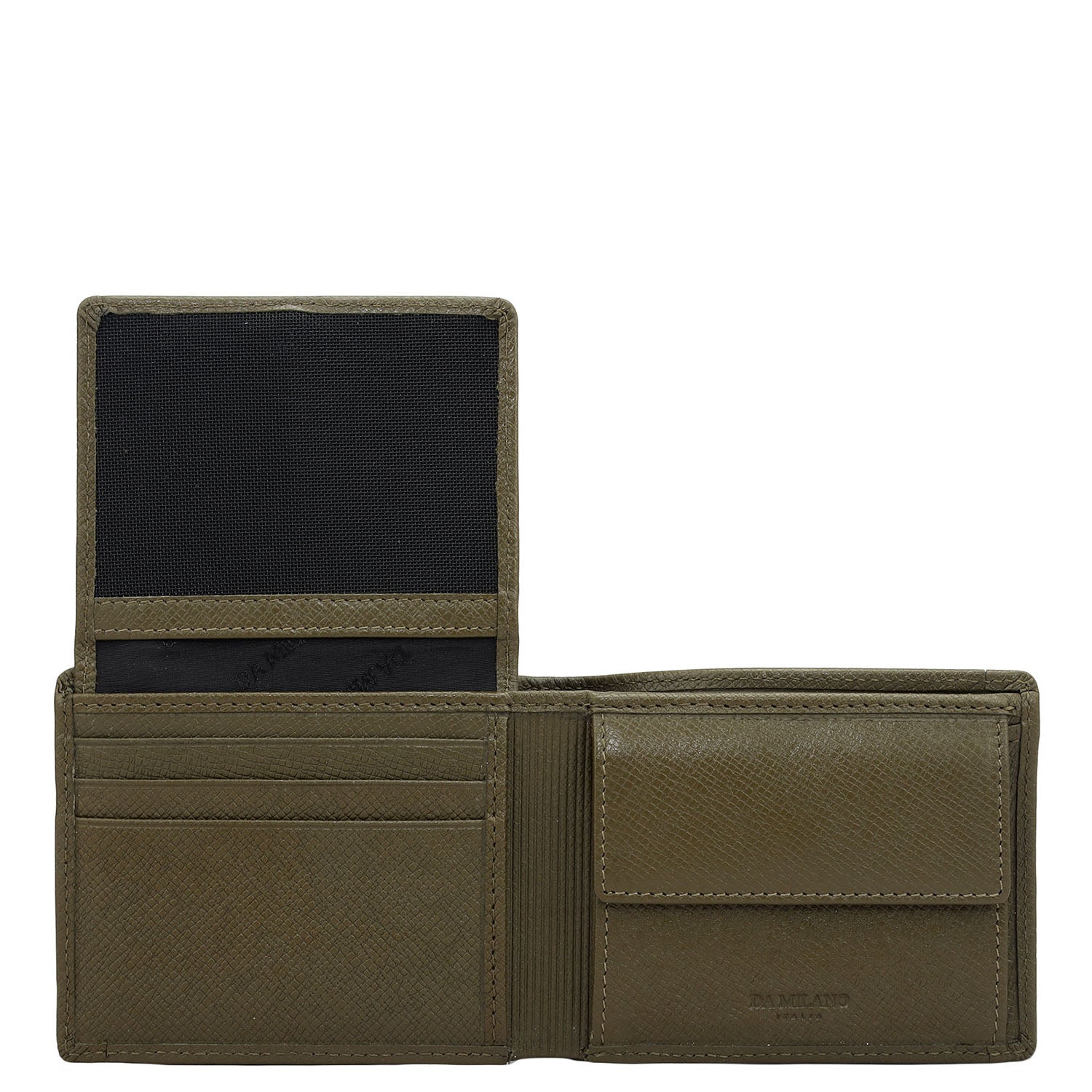 Crafted from textured leather, Da Milano men's bifold wallet offers a compact yet stylish design. Featuring easy-to-organize compartments, card slots, and pockets, it combines practicality with elegance. Subtle branding on the front enhances its refined appearance.