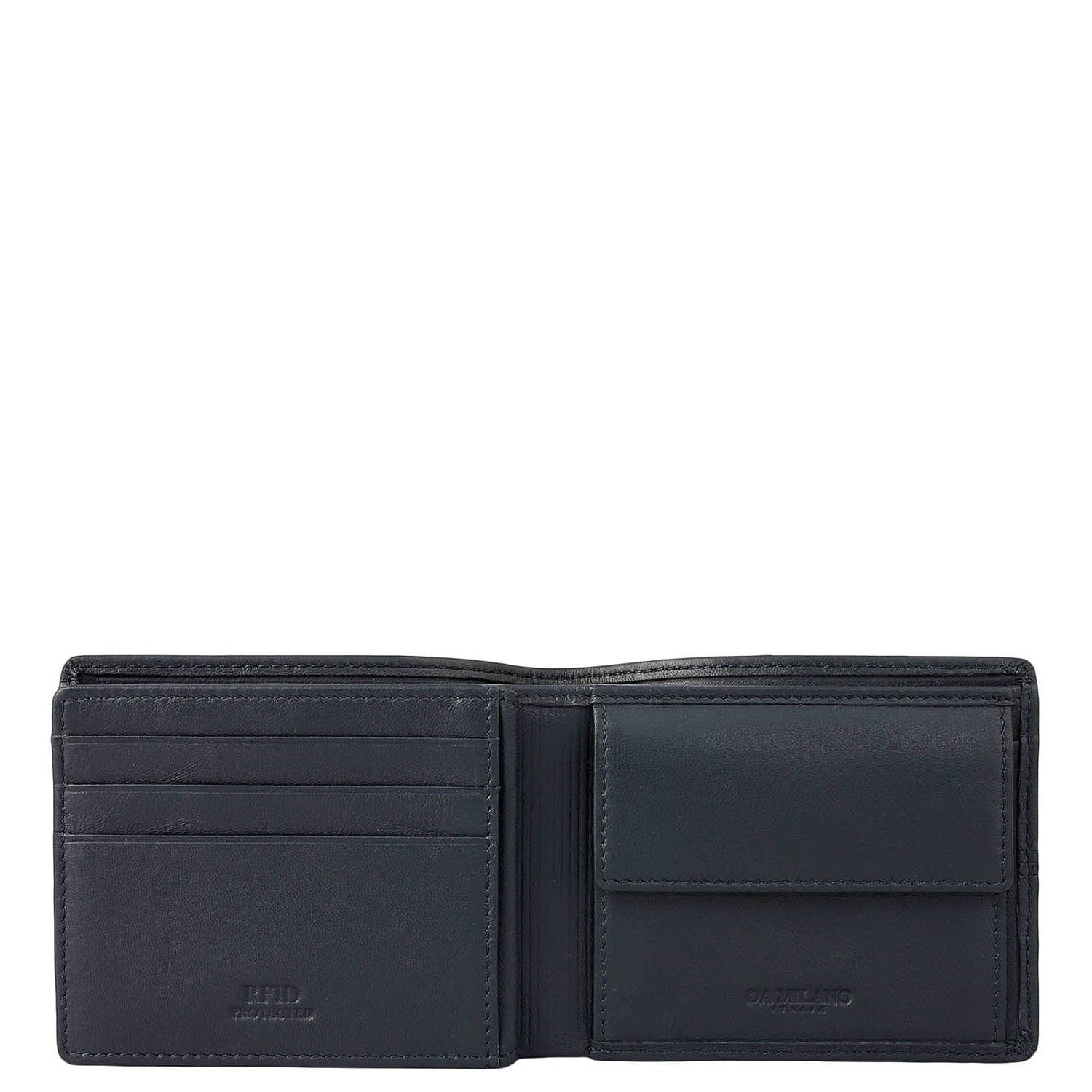 Crafted from textured leather, Da Milano men's bifold wallet offers a compact yet stylish design. Featuring easy-to-organize compartments, card slots, and pockets, it combines practicality with elegance. Subtle branding on the front enhances its refined appearance.