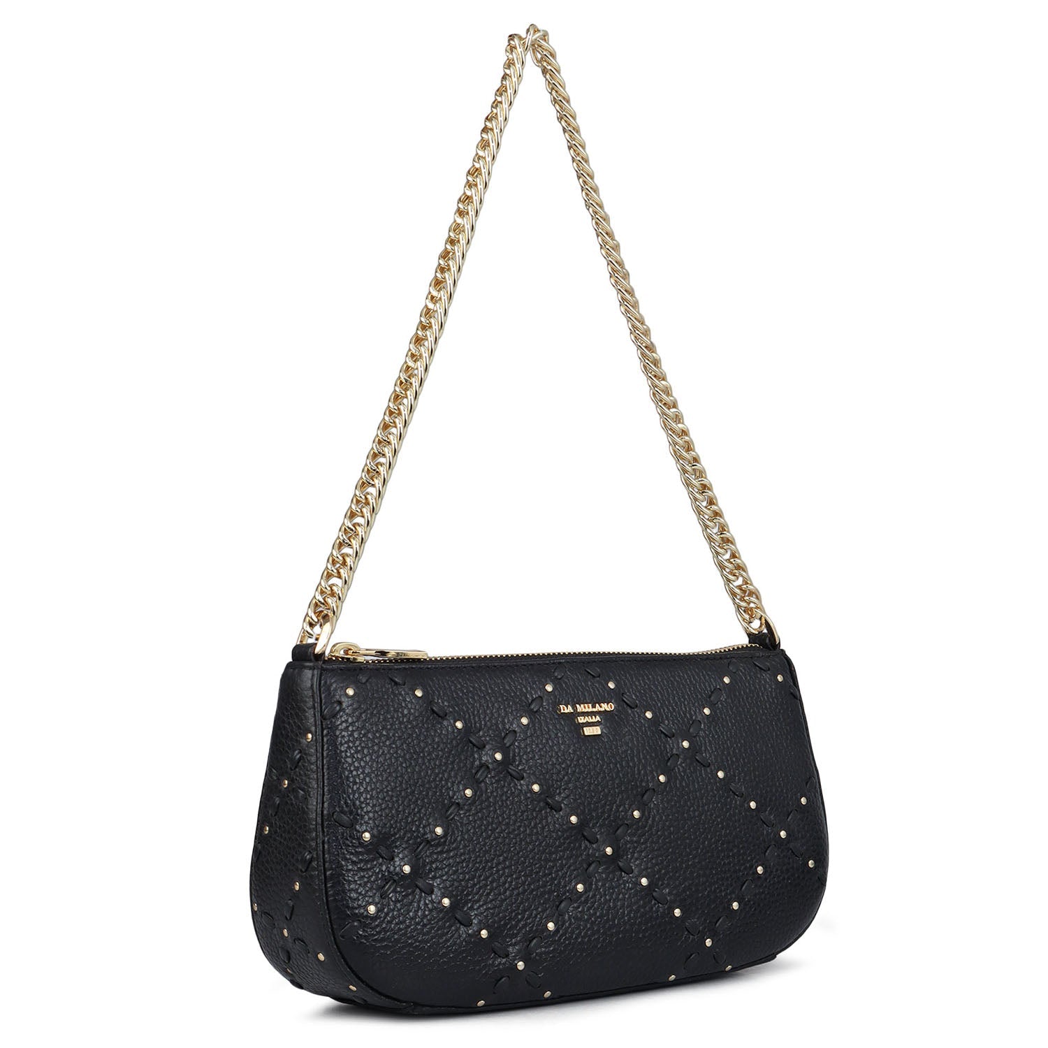 Chic and compact, this Baguette pairs timeless craftsmanship with a modern edge. Featuring the collection’s signature hand-laced diamond pattern and gleaming rivet accents, its surface tells a story of detail and dedication. The sleek top zip closure keeps essentials secure, while the metal chain handle adds a touch of shine and versatility — perfect for shoulder or elbow carry. Designed to elevate the everyday, this small statement piece brings handcrafted texture to minimalist form.