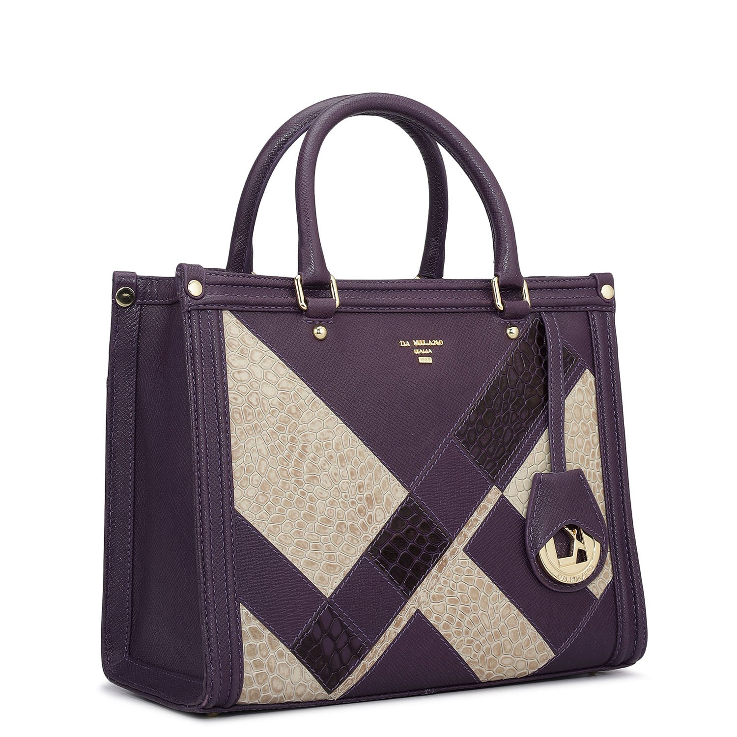 A modern classic with an artistic twist. Crafted in signature croco and franzy leathers, this elegant satchel features intricate patchwork detailing in rich shades of grapevine and ivory. The structured silhouette is balanced with soft curves, gold-tone hardware, and dual carry options—perfectly suited for work-to-weekend transitions.