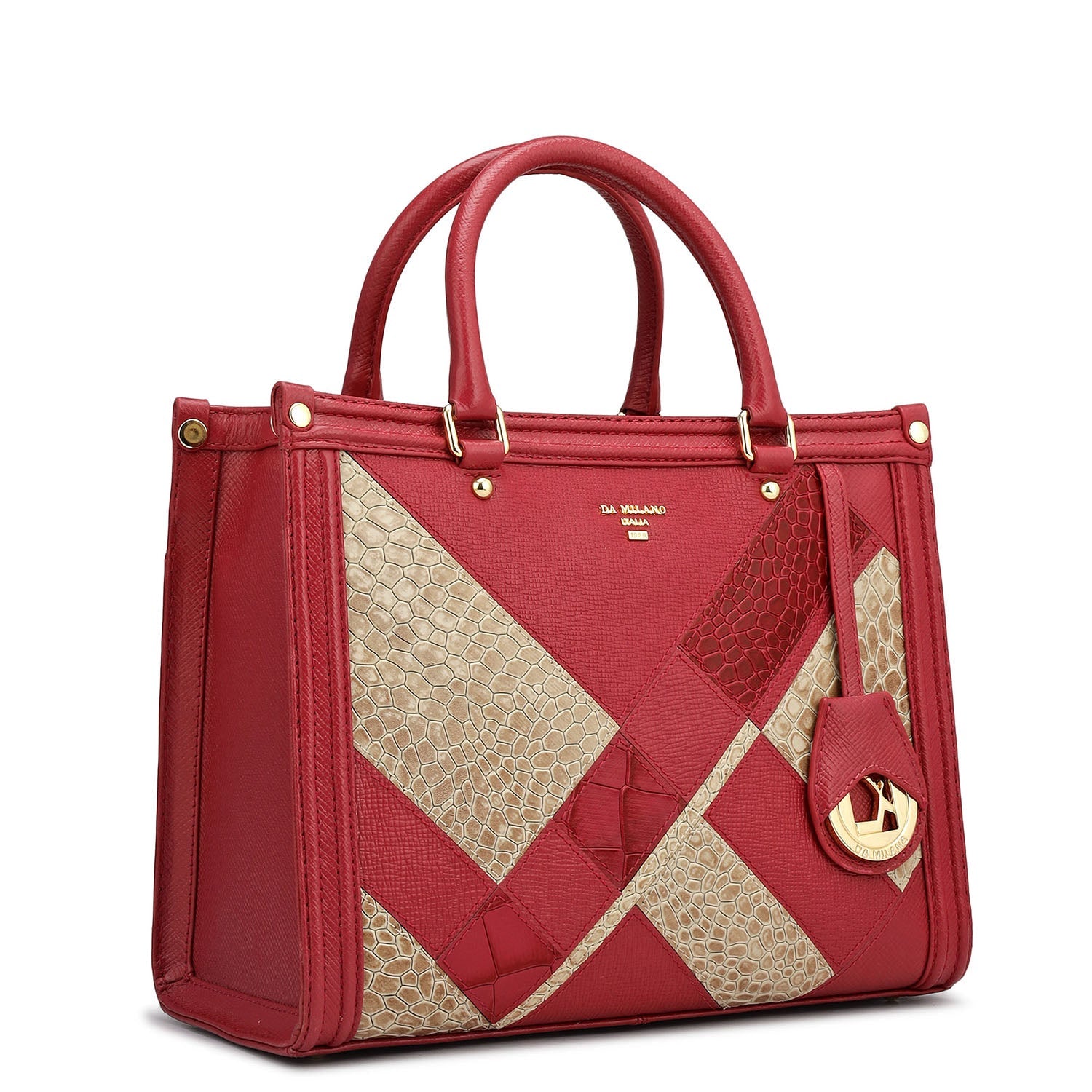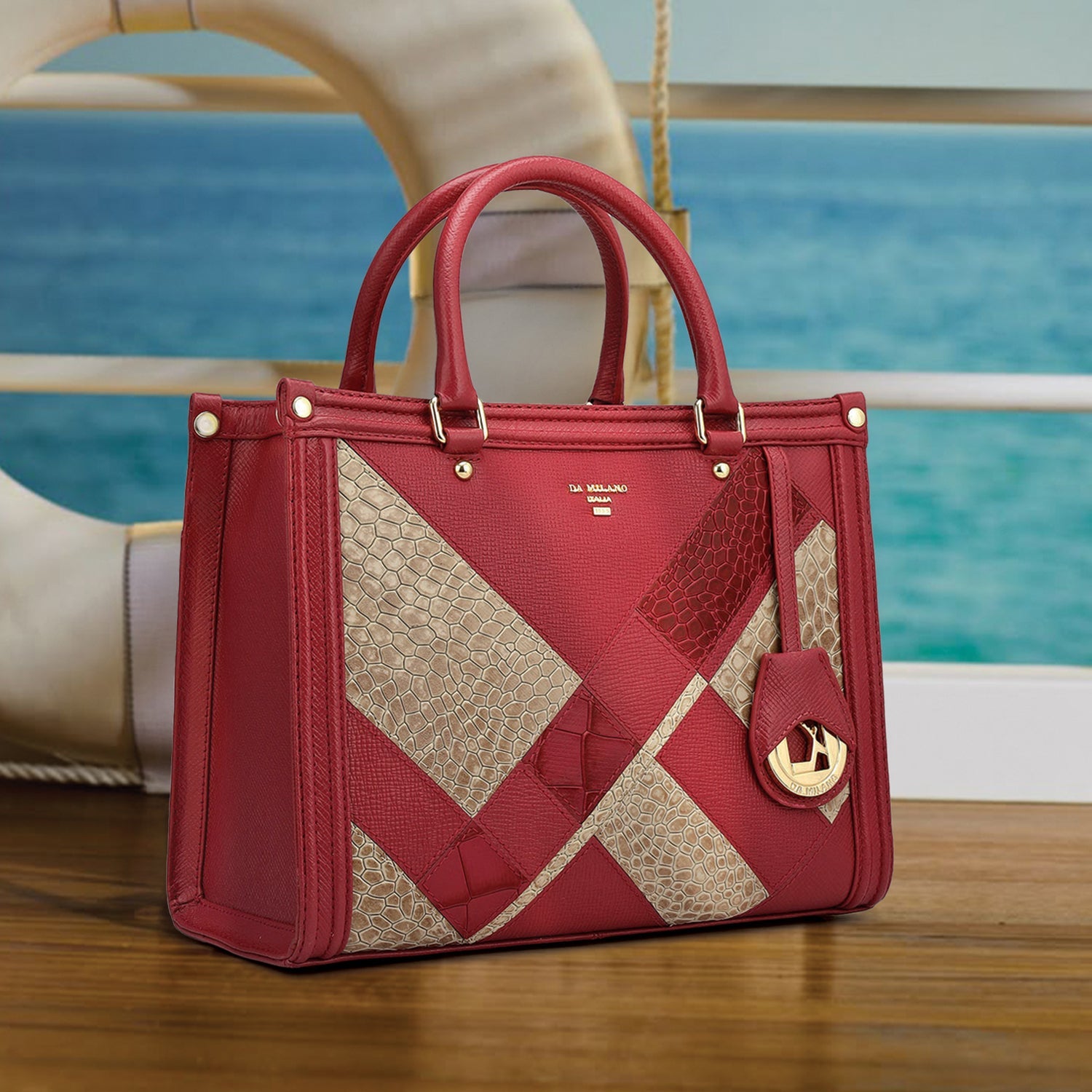 A modern classic with an artistic twist. Crafted in signature croco and franzy leathers, this elegant satchel features intricate patchwork detailing in rich shades of plumberry and ivory. The structured silhouette is balanced with soft curves, gold-tone hardware, and dual carry options—perfectly suited for work-to-weekend transitions.