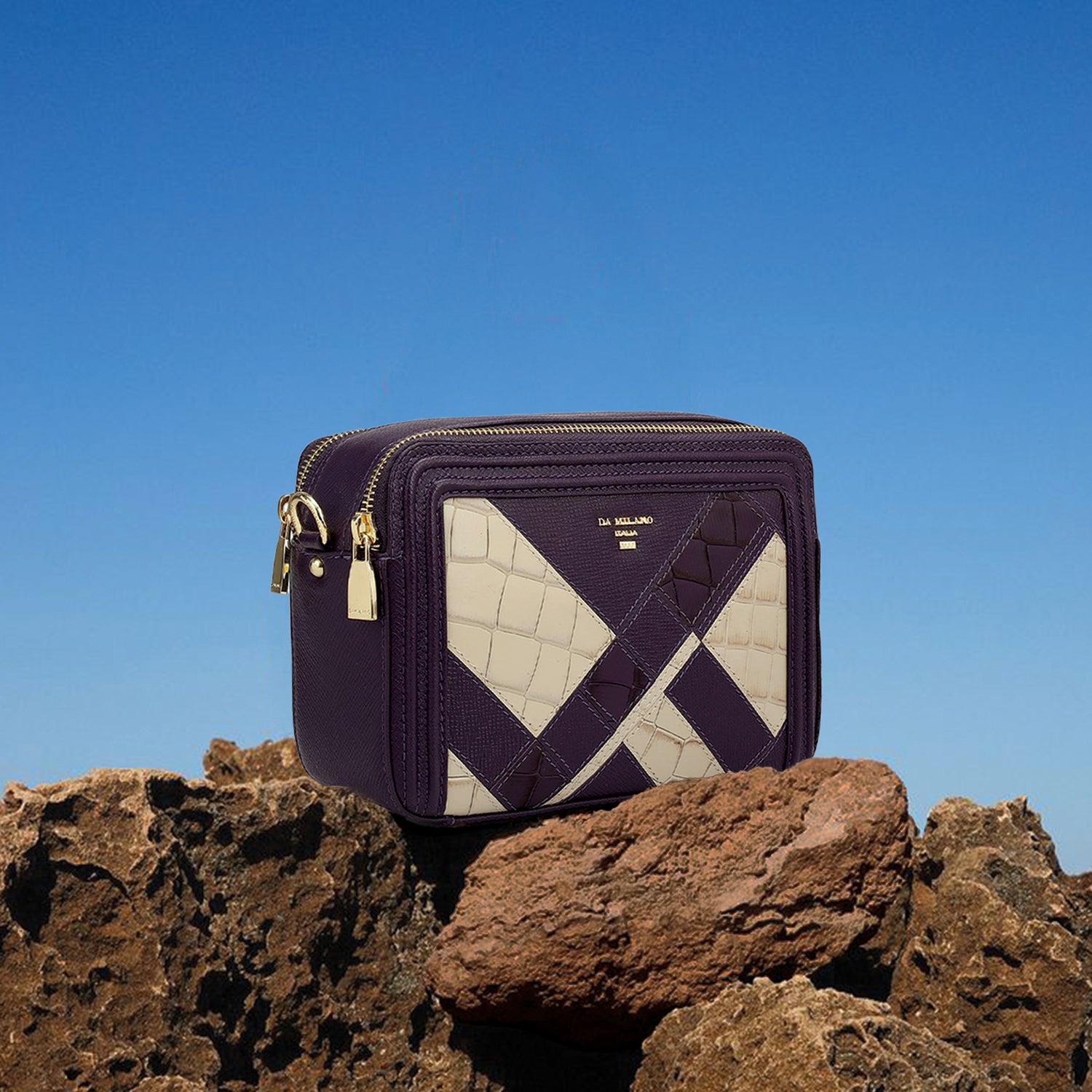 A striking fusion of texture and tone, this compact sling is crafted in croco-embossed leather with a luxe Franzy finish. The geometric patchwork in contrasting Grapevine and Frost hues adds a bold yet elegant character. Designed for day-to-evening ease, it features dual compartments and gold-tone accents—elevating every ensemble with artful precision.
